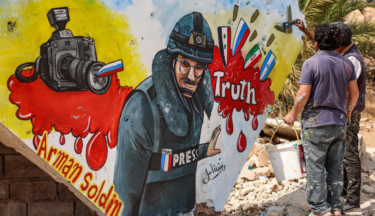 ์‹œ๋ฆฌ์•„ ์˜ˆ์ˆ ๊ฐ€๋“ค์ด ๋ฌด๋„ˆ์ง„ ๊ฑด๋ฌผ ๋ฒฝ์— AFP ๊ธฐ์ž ์•„๋ฅด๋งŒ ์†”๋”˜์„ ๊ทธ๋ฆฌ๊ณ  ์žˆ์Šต๋‹ˆ๋‹ค. ์†”๋”˜์€ ์ง€๋‚œ 9์ผ ์šฐ๋ฅด๋ผ์ด๋‚˜ ๊ฒฉ์ „์ง€ ๋ฐ”ํ๋ฌดํŠธ ์ธ๊ทผ์—์„œ ์ทจ์žฌ๋ฅผ ํ•˜๋‹ค ๋กœ์ผ“ ๊ณต๊ฒฉ์„ ๋ฐ›๊ณ ์„  ์ˆจ์กŒ์Šต๋‹ˆ๋‹ค.