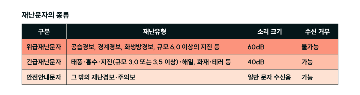 ๋ฌ ๋ฑ), ์์ ์๋ด๋ฌธ์(๊ทธ ๋ฐ์ ์ฌ๋๊ฒฝ๋ณด์ ์ฃผ์๋ณด)๋ก ๋๋์ด์. ์๊ธ์ฌ๋๋ฌธ์์ ๊ธด๊ธ์ฌ๋๋ฌธ์๋ ๋ฌธ์ ์๋ฆผ์์ด๋ ๋ค๋ฅธ ๊ฒฝ๋ณด์์ด ๋์. ์๊ธ์ฌ๋๋ฌธ์๋ ํด๋ํฐ ์ค์ ์ ๋ฐ๊ฟ๋ ์์ ์ ๊ฑฐ๋ถํ ์ ์๊ณ ์. |