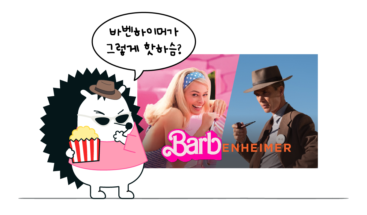 ์˜ํ™” '๋ฐ”๋น„'์™€ ์˜ํ™” '์˜คํŽœํ•˜์ด๋จธ'๋ฅผ ํ•ฉ์นœ ๋ง์ด์—์š”. ๊ทธ๋ ˆํƒ€ ๊ฑฐ์œ… ๊ฐ๋…์ด ์—ฐ์ถœํ•œ ๋ฐ”๋น„๋Š” ์„ธ๊ณ„์ ์ธ ์ธํ˜• ์‹œ๋ฆฌ์ฆˆ๋กœ ์œ ๋ช…ํ•œ ๋ฐ”๋น„๋ฅผ ํ˜„๋Œ€์ ์œผ๋กœ ์žฌํ•ด์„ํ•œ ํŒํƒ€์ง€·์ฝ”๋ฏธ๋”” ์˜ํ™”๋กœ, ๋ถ„ํ™๋น›์˜ ๋ฐ๊ณ  ํ™”๋ คํ•œ ์ด๋ฏธ์ง€๊ฐ€ ํŠน์ง•์ด๋ผ๊ณ . ํฌ๋ฆฌ์Šคํ† ํผ ๋†€๋ž€ ๊ฐ๋…์˜ ์˜คํŽœํ•˜์ด๋จธ๋Š” ์ธ๋ฅ˜ ์ตœ์ดˆ์˜ ํ•ต๋ฌด๊ธฐ ๊ฐœ๋ฐœ ํ”„๋กœ์ ํŠธ๋ฅผ ์ด๋ˆ ๋ฌผ๋ฆฌํ•™์ž ์˜คํŽœํ•˜์ด๋จธ์˜ ์ด์•ผ๊ธฐ๋ฅผ ๋‹ด์•˜๋Š”๋ฐ์š”. ์ œ2์ฐจ ์„ธ๊ณ„๋Œ€์ „์„ ๋ฐฐ๊ฒฝ์œผ๋กœ ํ•˜๋Š” ์—ญ์‚ฌ๋ฌผ์ด๊ณ , ์ฃผ์ œ ํŠน์„ฑ์ƒ ์–ด๋‘ก๊ณ  ์ง„์ง€ํ•œ ๋ถ„์œ„๊ธฐ์˜ˆ์š”. ์ด์ฒ˜๋Ÿผ ๋‘ ์˜ํ™”๋Š” ์ „ํ˜€ ๋‹ฌ๋ผ ๋ณด์ด์ง€๋งŒ, ์˜์™ธ๋กœ ํ™˜์ƒ์˜ ์กฐํ•ฉ์ด๋ผ ๋ฏธ๊ตญ์—์„œ๋Š” ๋‘ ์˜ํ™”๋ฅผ ๊ทน์žฅ์—์„œ ์—ฐ๋‹ฌ์•„ ์ด์–ด ๋ณด๋Š” ๊ฒŒ ์š”์ฆ˜ ํŠธ๋ Œ๋“œ์˜ˆ์š”. ๋‘ ์˜ํ™”์˜ ํฌ์Šคํ„ฐ๋ฅผ ํ•ฉ์„ฑํ•˜๊ณ , ํ‹ฐ์…”์ธ ๋ฅผ ๋งŒ๋“œ๋Š” ๋“ฑ ๋ฐˆ ๋†€์ด๋„ ์ธ๊ธฐ์ด๊ณ ์š”. ์˜๊ตญ·์ธ๋„·ํ˜ธ์ฃผ ๋“ฑ์—์„œ๋„ ๋ฐ”๋ฒคํ•˜์ด๋จธ ์—ดํ’์ด ๋ถˆ๊ณ  ์žˆ๋‹ค๊ณ  ๐Ÿ’ฅ.