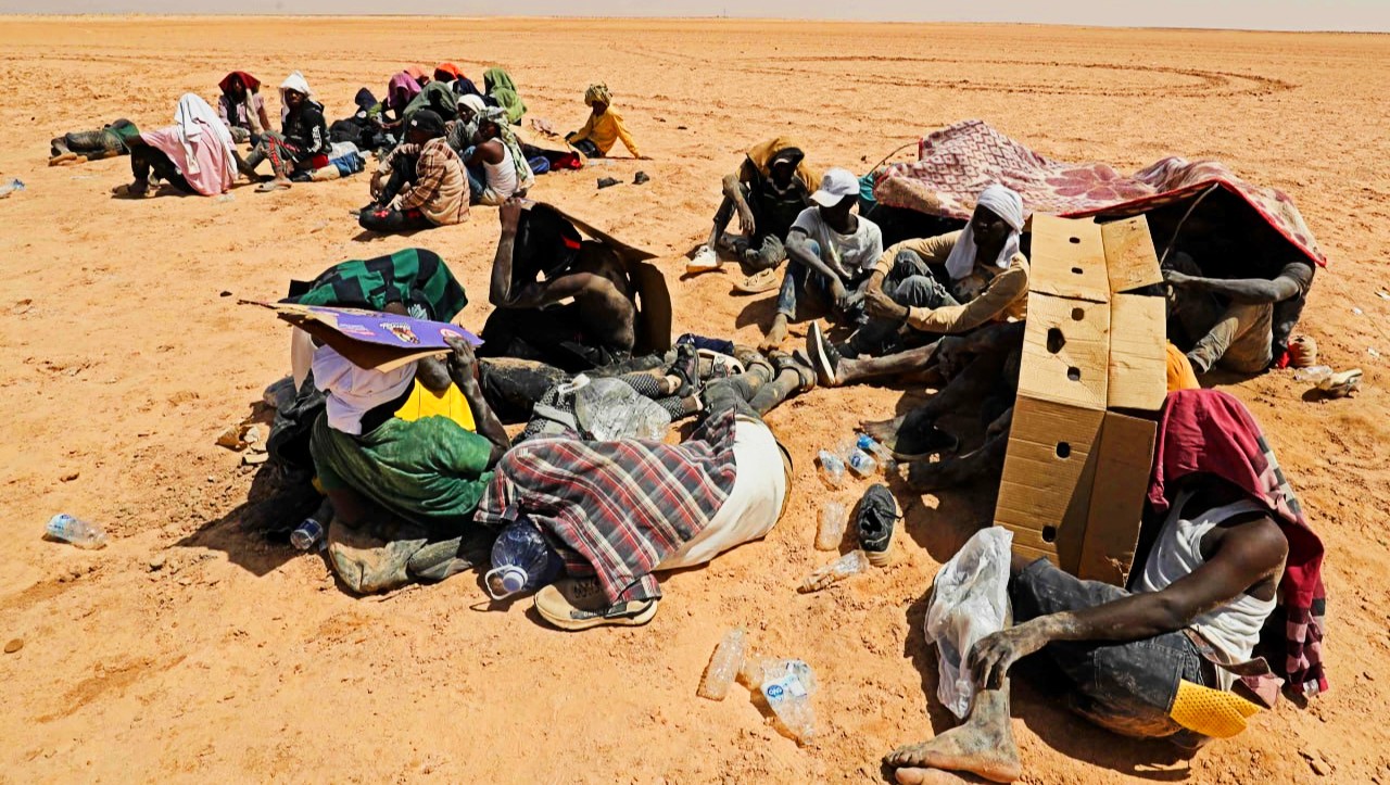 16์ผ ๋ฆฌ๋น„์•„ ๊ตญ๊ฒฝ ํ•œ ๋งˆ์„ ์ธ๊ทผ. ์•„ํ”„๋ฆฌ์นด ๋‚œ๋ฏผ๋“ค์ด ๋ฐ•์Šค๋‚˜ ์˜ท์œผ๋กœ ๋œจ๊ฑฐ์šด ํ–‡๋น›์„ ๊ฐ€๋ฆฌ๊ณ  ์žˆ์Šต๋‹ˆ๋‹ค. ํŠ€๋‹ˆ์ง€ ์ •๋ถ€๊ฐ€ ๋ฌผ๊ณผ ์‹๋Ÿ‰๋„ ์ฃผ์ง€ ์•Š์€ ์ฑ„ ์ด๋“ค์„ ์‚ฌ๋ง‰์— ๋ฒ„๋ฆฌ๊ณ  ๋– ๋‚œ ๊ฑด๋ฐ์š”. ์•„ํ”„๋ฆฌ์นด์—์„œ ์œ ๋Ÿฝ์œผ๋กœ ๊ฐ€๋Š” ๊ธธ๋ชฉ์— ์žˆ๋Š” ๋ฆฌ๋น„์•„์™€ ํŠ€๋‹ˆ์ง€๋Š” ๋ฐ€๋ ค๋“œ๋Š” ๋‚œ๋ฏผ์— ๋Œ€ํ•œ ์ฑ…์ž„์„ ์„œ๋กœ์—๊ฒŒ ๋ฏธ๋ฃจ๊ณ  ์žˆ์Šต๋‹ˆ๋‹ค.