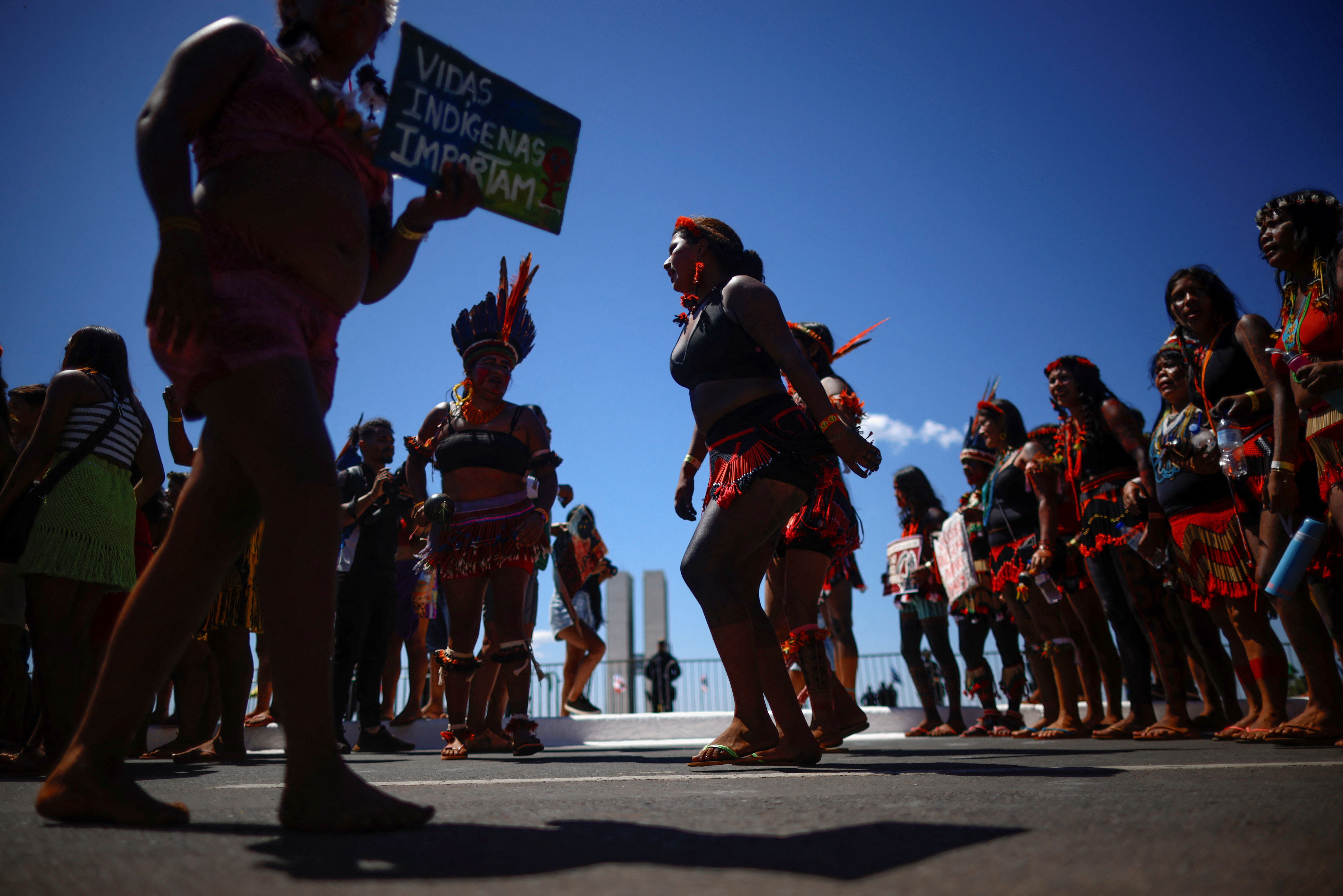 ๋ธŒ๋ผ์งˆ์—์„œ ์—ด๋ฆฐ '์›์ฃผ๋ฏผ ์—ฌ์„ฑ ํ–‰์ง„'. ์ „ ์„ธ๊ณ„์—์„œ ์˜จ ์›์ฃผ๋ฏผ ์—ฌ์„ฑ 6000์—ฌ๋ช…์ด ํ•จ๊ป˜ ๊ฑท๊ณ  ์žˆ์Šต๋‹ˆ๋‹ค. ์ด๋“ค์€ ์›์ฃผ๋ฏผ ์—ฌ์„ฑ์„ ํ–ฅํ•œ ํญ๋ ฅ์„ ๋ฉˆ์ถ”๋ผ๊ณ  ์™ธ์ณค์Šต๋‹ˆ๋‹ค. ์–‘์งˆ์˜ ์˜๋ฃŒ์™€ ๊ต์œก, ์ผํ•  ๊ธฐํšŒ๋ฅผ ์ œ๊ณตํ•˜๋ผ๊ณ  ์š”๊ตฌํ•˜๊ธฐ๋„ ํ–ˆ์Šต๋‹ˆ๋‹ค.