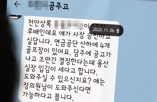 ์ •์ง„์„ ๊ตญ๋ฏผ์˜ํž˜ ์˜์›์ด ์ง€์—ญ๊ตฌ ๊ณ ๊ต ๋™์ฐฝํšŒ์žฅ์—๊ฒŒ์„œ ๋ฐ›์€ ๋ฌธ์ž๋ฉ”์‹œ์ง€์ž…๋‹ˆ๋‹ค. ํ›„๋ฐฐ๊ฐ€ ๊ณต๋ฌด์›์—ฐ๊ธˆ๊ณต๋‹จ ์‚ฐํ•˜ ์—…์ฒด์˜ ์‚ฌ์žฅ์ด ๋  ์ˆ˜ ์žˆ๊ฒŒ '์šฉ์‚ฐ'์— ํž˜ ์ข€ ์จ๋‹ฌ๋ž€ ๋‚ด์šฉ์ธ๋ฐ์š”. ์•ˆ ๊ฑธ๋ ธ์œผ๋ฉด ์ด ์ฒญํƒ, ์„ฑ๊ณตํ–ˆ์„๊นŒ์š”?