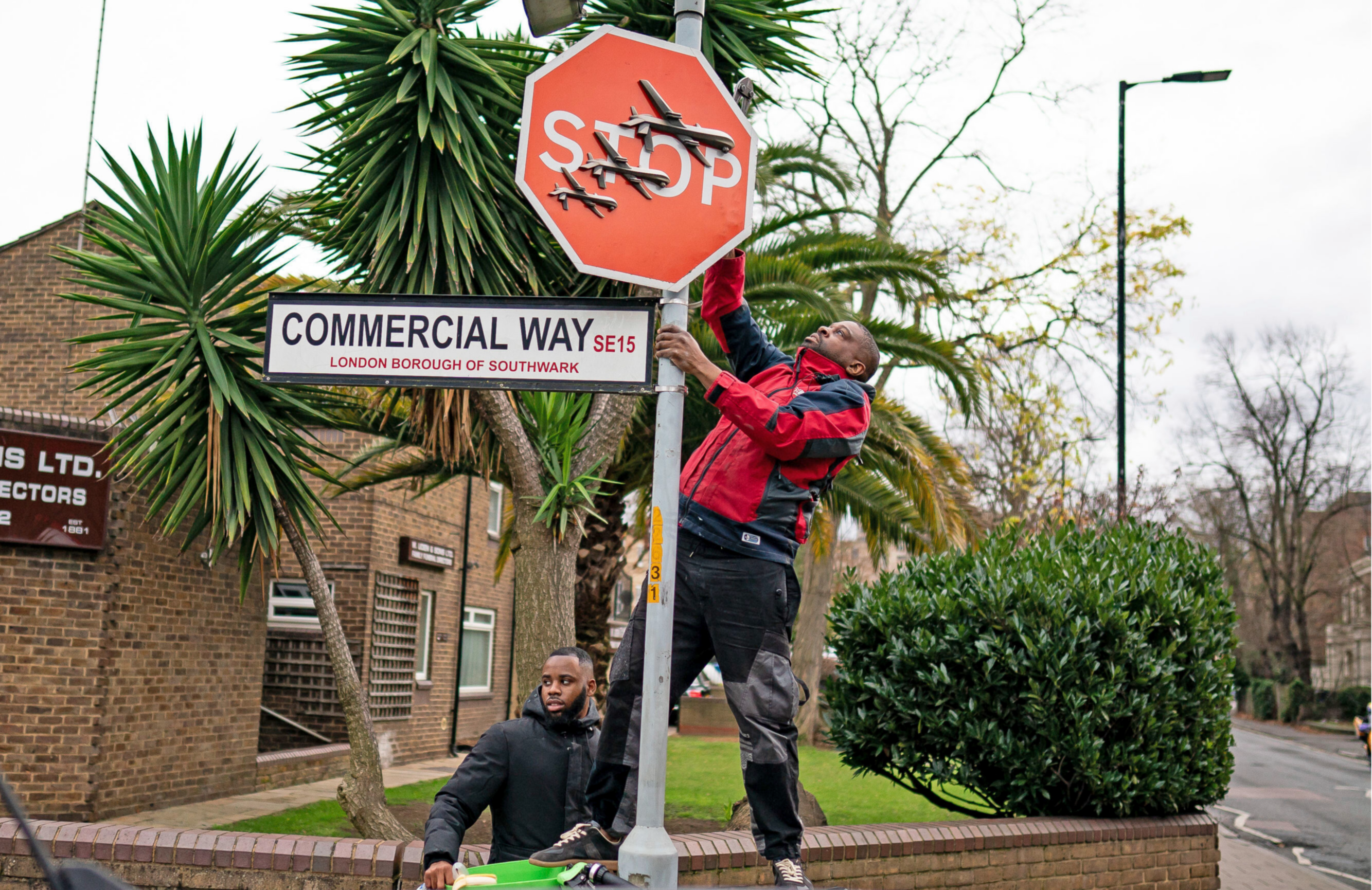 ์–ผ๊ตด๋„ ์•ˆ ๊ฐ€๋ฆฐ ๋‚จ์„ฑ 2๋ช…์ด ์˜๊ตญ ๋Ÿฐ๋˜์˜ ํ•œ ๊ต์ฐจ๋กœ์— ์žˆ๋Š” '์ •์ง€' ํ‘œ์ง€ํŒ์„ ํ›”์น˜๊ณ  ์žˆ์Šต๋‹ˆ๋‹ค. ๊ตฐ์šฉ ๋“œ๋ก ์ด ๊ทธ๋ ค์ง„ ์ด ํ‘œ์ง€ํŒ์€ '์–ผ๊ตด ์—†๋Š” ๊ฑฐ๋ฆฌ์˜ ํ™”๊ฐ€' ๋ฑ…ํฌ์‹œ์˜ ์ž‘ํ’ˆ์ž…๋‹ˆ๋‹ค. ๊ณผ๊ฑฐ ๋„๋‘‘๋งž์•˜๋˜ ๊ทธ์˜ ์ž‘ํ’ˆ์ฒ˜๋Ÿผ ์ด๋ฒˆ์—๋„ ๋ฌด์‚ฌํžˆ ๋Œ์•„์˜ฌ๊นŒ์š”?๐Ÿ‘‰๊ธฐ์‚ฌ๋ณด๊ธฐ