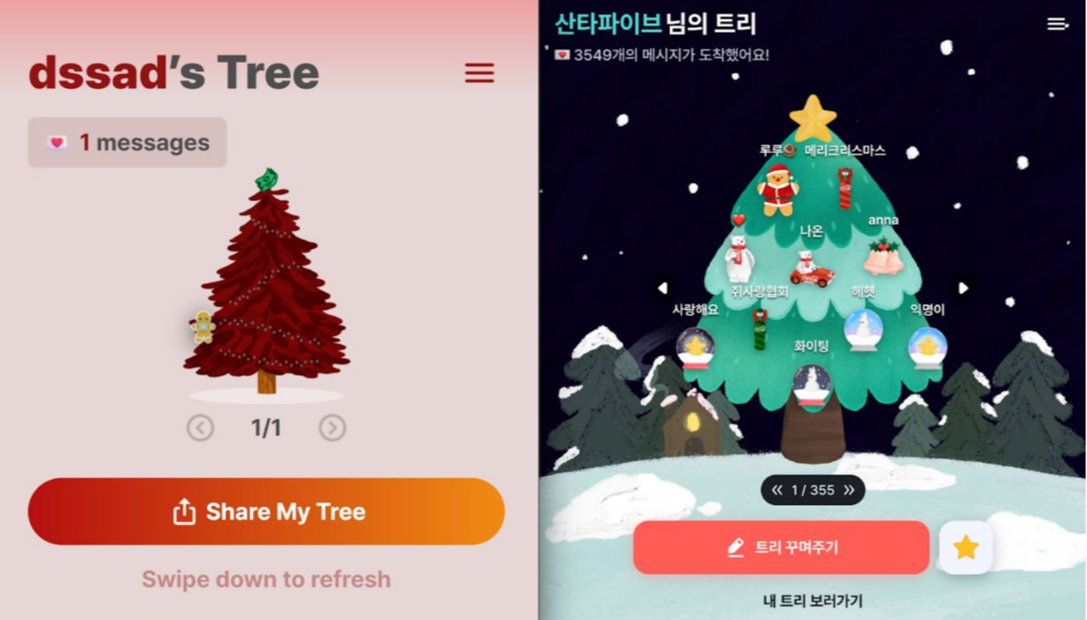 ์ต๋ช…์˜ ํŽธ์ง€๋ฅผ ํฌ๋ฆฌ์Šค๋งˆ์Šค ํŠธ๋ฆฌ ์žฅ์‹์œผ๋กœ ๋‹ฌ์•„์ฃผ๋Š” ์˜จ๋ผ์ธ ์„œ๋น„์Šค๋“ค์ž…๋‹ˆ๋‹ค. ์–ผํ• ๋ด๋„ ๋‘ ์„œ๋น„์Šค ์ด๋ฏธ์ง€๊ฐ€ ๋น„์Šทํ•œ๋ฐ์š”. ํ•œ ์„œ๋น„์Šค๊ฐ€ ๋‹ค๋ฅธ ์„œ๋น„์Šค๋ฅผ ๋ฒ ๊ผˆ๋‹จ ์˜ํ˜น์ด ๋‚˜์™”์Šต๋‹ˆ๋‹ค.