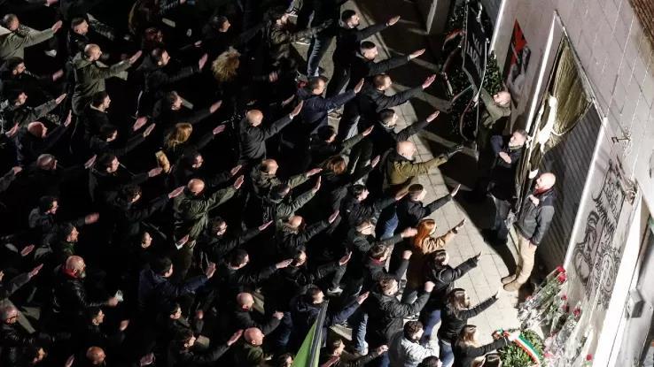 ์ดํƒˆ๋ฆฌ์•„ ์‹ ํŒŒ์‹œ์ฆ˜ ์ถ”์ข…์ž๋“ค์ด ์†๋ฐ”๋‹ฅ์„ ์•„๋ž˜๋กœ ํ•œ ์ฑ„ ํŒ”์„ ๋ป—๋Š” '๋กœ๋งˆ์‹ ๊ฒฝ๋ก€'๋ฅผ ํ•˜๊ณ  ์žˆ์Šต๋‹ˆ๋‹ค. 1922๋…„ ๋…์žฌ์ž ๋ฌด์†”๋ฆฌ๋‹ˆ ์ง‘๊ถŒ ๋‹น์‹œ ํŒŒ์‹œ์ŠคํŠธ(์ „์ฒด์ฃผ์˜ ์‹ ๋ด‰์ž)๋“ค์ด ํ•˜๋˜ ๊ฒฝ๋ก€๋ฒ•์ธ๋ฐ์š”. ์ดํƒˆ๋ฆฌ์•„๊ฐ€ ๋ฐœ์นต ๋’ค์ง‘ํ˜”์Šต๋‹ˆ๋‹ค.๐Ÿ‘‰๊ธฐ์‚ฌ๋ณด๊ธฐ