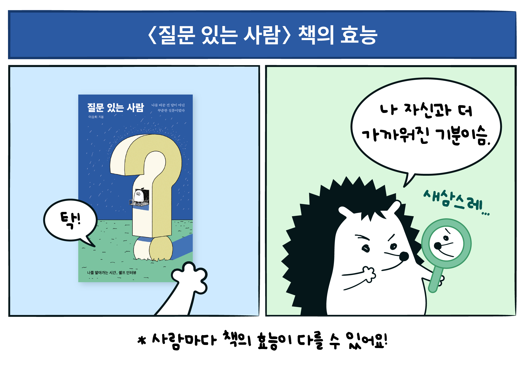 ํ ๊ถ์ ์ถ์ฒํ ๊ฒ์. ๋ฐ๋ก ์ด์นํฌ ๋ง์ผํฐ์ ' ์ง๋ฌธํ๋ ์ฌ๋'์ด์์. '์ง๊ธ์ ๋๋ฅผ ๋ค์ฌ๋ค๋ณด๋ ์ง๋ฌธ', '์ข ๋ ๋นจ๋ฆฌ ํ์ผ๋ฉด ์ข์์ ์ง๋ฌธ', '์์ผ๋ก ์์ฃผ ํด์ผ ํ ์ง๋ฌธ' ๋ฑ ๋๋ฅผ ์์๊ฐ๋ ๋ฐ ํ์ํ ์ง๋ฌธ๊ณผ ๊ทธ์ ๋ํ ์ ์์ ๋ต์ ์ ๋ฆฌํ์ด์.