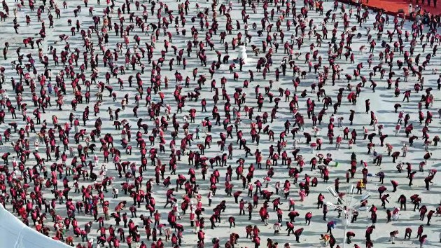 ๋ถ‰์€ ์กฐ๋ผ๋ฅผ ์ž…์€ ์‚ฌ๋žŒ๋“ค์ด 'ํŒฝ์ด์น˜๊ธฐ ์ตœ๋‹ค ์ธ์›' ์„ธ๊ณ„ ์‹ ๊ธฐ๋ก์„ ๊นจ๋ ค๊ณ  ์—ด์‹ฌํžˆ ํŒฝ์ด๋ฅผ ์น˜๊ณ  ์žˆ์Šต๋‹ˆ๋‹ค. 1000๋ช… ์ด์ƒ์ด ๋‹คํ•จ๊ป˜ 5๋ถ„ ์ด์ƒ ํŒฝ์ด๋ฅผ ๋Œ๋ ค์•ผ ์‹ ๊ธฐ๋ก์„ ๊ฐˆ์•„์น˜์šธ ์ˆ˜ ์žˆ์—ˆ๋Š”๋ฐ์š”. ์ค‘๊ตญ ์ง€๋ฆฐ์„ฑ์— ๋ชจ์ธ 1946๋ช…์ด ๋„์ „์— ์„ฑ๊ณตํ–ˆ์Šต๋‹ˆ๋‹ค.
