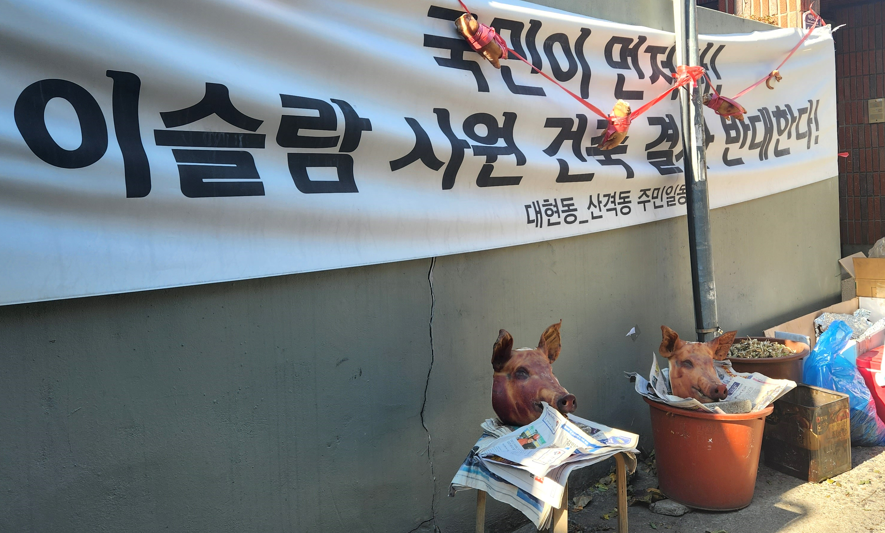 ๋Œ€๊ตฌ์˜ ์ด์Šฌ๋žŒ์‚ฌ์› ๊ฑด๋ฆฝ ๊ณต์‚ฌ๋Š” 4๋…„์งธ ๋ฉˆ์ถฐ์žˆ์Šต๋‹ˆ๋‹ค. ๊ณต์‚ฌ์žฅ ์•ž์— ๋ฌด์Šฌ๋ฆผ ๊ธˆ๊ธฐ ์‹ํ’ˆ์ธ ๋ผ์ง€๋จธ๋ฆฌ๋ฅผ ๋‘” ์ผ๋ถ€ ์ฃผ๋ฏผ์˜ ๋ฐ˜๋Œ€์‹œ์œ„ ๋•Œ๋ฌธ์ด๊ธฐ๋„ ํ•œ๋ฐ์š”. ๊ฒ€์ฐฐ์€ ์ฃผ๋ฏผ์ด ๊ณต์‚ฌ๋ฅผ ๋ฐฉํ•ดํ•œ ๊ฑด ์•„๋‹ˆ๋ผ๊ณ  ํŒ๋‹จํ–ˆ์Šต๋‹ˆ๋‹ค.
