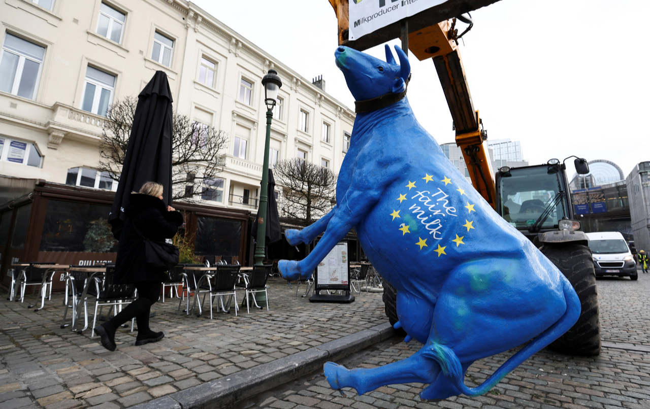๋ฒจ๊ธฐ์— ์œ ๋Ÿฝ์—ฐํ•ฉ(EU) ์˜ํšŒ ์•ž. EU ๊นƒ๋ฐœ ๋ชจ์–‘์œผ๋กœ ์ƒ‰์น ํ•œ ์†Œ ์กฐํ˜•๋ฌผ์ด ์ค‘์žฅ๋น„์— ๋งค๋‹ฌ๋ ค ์žˆ์Šต๋‹ˆ๋‹ค. ์ด๋ฒˆ ์‹œ์œ„๋Š” ํ”„๋ž‘์Šค ๋†๋ฏผ๋‹จ์ฒด๊ฐ€ ์ฃผ๋„ํ–ˆ๋Š”๋ฐ์š”. ์ด๋“ค์€ ํƒ„์†Œ ์ค‘๋ฆฝ์„ ์œ„ํ•œ EU์˜ ํ™˜๊ฒฝ ๊ทœ์ œ๋กœ ๋น„์šฉ ๋ถ€๋‹ด์ด ์ปค์กŒ์œผ๋‹ˆ, ๋†์‚ฐ๋ฌผ ๊ฐ€๊ฒฉ์„ ์˜ฌ๋ ค์•ผ ํ•œ๋‹ค๊ณ  ์ฃผ์žฅํ–ˆ์Šต๋‹ˆ๋‹ค.๐Ÿ‘‰๊ธฐ์‚ฌ๋ณด๊ธฐ