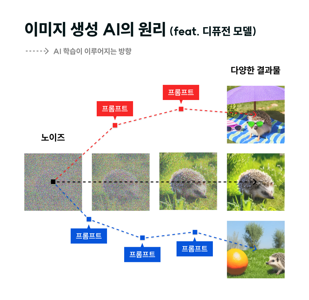 ์ด๋ฏธ์ง€ ์ƒ์„ฑ ๋ชจ๋ธ์€ ํ…์ŠคํŠธ๋กœ ๋ช…๋ น์–ด(ํ”„๋กฌํ”„ํŠธ)๋ฅผ ์ž…๋ ฅํ•˜๋ฉด ์ด๋ฅผ ๋ฐ”ํƒ•์œผ๋กœ ์ด๋ฏธ์ง€๋ฅผ ๋งŒ๋“ค์–ด์š”. ๊ฐ€์žฅ ๋„๋ฆฌ ์‚ฌ์šฉ๋˜๋Š” ๋””ํ“จ์ „ ๋ชจ๋ธ(Diffusion model)์ด๋ผ๋Š” ๋ฐฉ์‹์„ ์„ค๋ช…๋“œ๋ฆฌ์ž๋ฉด, "๋…ธ์ด์ฆˆ ๊ฐ€๋“ํ•œ ํ™”๋ฉด์—์„œ ์‹œ์ž‘ํ•ด ์›ํ•˜๋Š” ์ด๋ฏธ์ง€๋กœ ๊ฐ€๋Š” ๊ธธ์ฐพ๊ธฐ"๋ผ๊ณ  ์ดํ•ดํ•˜์‹œ๋ฉด ๋ผ์š”. ํ”„๋กฌํ”„ํŠธ๋ฅผ ์ž…๋ ฅํ•˜๋ฉด AI๋Š” ํ•™์Šตํ•œ ๋‚ด์šฉ์„ ๋ฐ”ํƒ•์œผ๋กœ ๋…ธ์ด์ฆˆ๋ฅผ ๊ฑท์–ด๋‚ด๊ณ  ์ด๋ฏธ์ง€๋ฅผ ์™„์„ฑํ•˜๋Š”๋ฐ์š”. ์ด ๊ณผ์ •์—์„œ ํ”„๋กฌํ”„ํŠธ๋ฅผ ์–ด๋–ป๊ฒŒ ์ถ”๊ฐ€ํ•˜๋А๋ƒ์— ๋”ฐ๋ผ ๋‹ค์–‘ํ•œ ๊ฒฐ๊ณผ๋ฌผ์ด ๋‚˜์™€์š”. AI๊ฐ€ ํ•™์Šตํ•œ '๊ณ ์Šด๋„์น˜'๋Š” A์ธ๋ฐ, ํ”„๋กฌํ”„ํŠธ์— '์ถค์ถ”๋Š” ๊ณ ์Šด๋„์น˜'๋ฅผ ์ž…๋ ฅํ•˜๋ฉด ์ด๊ฑธ ๋ฐ”ํƒ•์œผ๋กœ ์ „ํ˜€ ์ƒˆ๋กœ์šด ๊ธธ์„ ์ฐพ์•„ ๊ณ ์Šด๋„์น˜ ์ด๋ฏธ์ง€ B๊ฐ€ ๋งŒ๋“ค์–ด์ง€๋Š” ๊ฑฐ์ฃ .