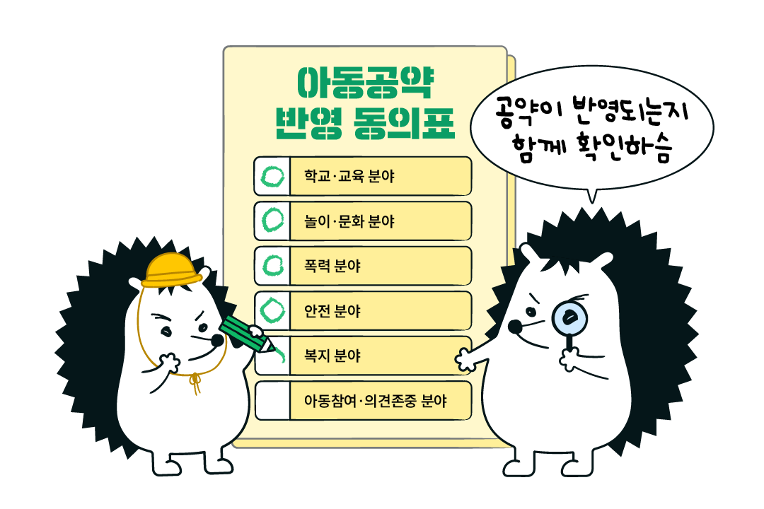 ์๊ฒ ์๊ฒฌ์ ๋ฌผ์์ด์. ์ด๋ฅผ ๋ฐํ์ผ๋ก ๊ต์ก·ํ๊ต, ๋์ด·๋ฌธํ, ํญ๋ ฅ, ์์ , ๋ณต์ง, ์๊ฒฌ์กด์ค·์๋ ์ฐธ์ฌ ๋ฑ 6๊ฐ ๋ถ์ผ 18๊ฐ ๊ณต์ฝ์ ์ ์ ํ๊ณ ์. ๋ํ์ ์ธ ๊ณต์ฝ ๋ช ๊ฐ์ง๋ง ๋ณด์๋ฉด: - ๐ง: "์๋์ด ์์ ํ๊ฒ ์ง๋ผ ์ ์๋ ํ๊ฒฝ์ ๋ง๋ค์ด ์ฃผ์ธ์."