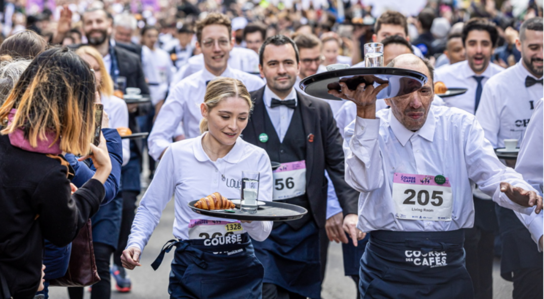 ํ”„๋ž‘์Šค ์›จ์ดํ„ฐ 200์—ฌ๋ช…์ด ํฌ๋ฃจ์•„์ƒ, ์ปคํ”ผ์ž”, ๋ฌผ์ปต์ด ๋‹ด๊ธด ์Ÿ๋ฐ˜์„ ๋“ค๊ณ  ๋‹ฌ๋ฆฌ๊ณ  ์žˆ์Šต๋‹ˆ๋‹ค. 110๋…„ ๋œ ์›จ์ดํ„ฐ ๊ฒฝ์ฃผ๋Œ€ํšŒ์ธ๋ฐ์š”. ์ด๋ฒˆ์—” ์šฐ์Šน ์ƒํ’ˆ์ด ์ข€ ํŠน๋ณ„ํ•ฉ๋‹ˆ๋‹ค.(AP ์—ฐํ•ฉ๋‰ด์Šค)