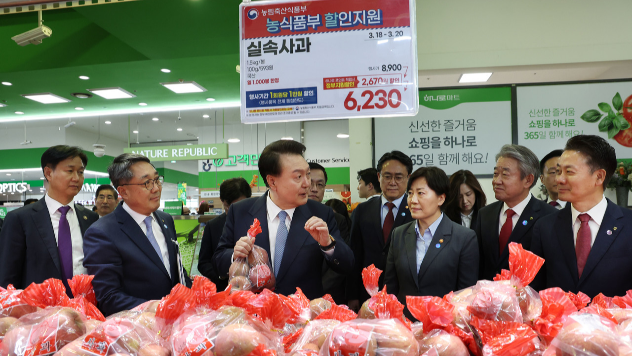 ์œค์„์—ด ๋Œ€ํ†ต๋ น์ด ์žฅ๋ฐ”๊ตฌ๋‹ˆ ๋ฌผ๊ฐ€๋ฅผ ๋‚ด๋ฆฌ๋ผ๊ณ  ์ง€์‹œํ–ˆ์Šต๋‹ˆ๋‹ค. ๊ฐ’์ด ํญ๋“ฑํ•œ ์‚ฌ๊ณผ๋Š” ํŒŒ๊ฒฉ์ ์œผ๋กœ ์ง€์›ํ•˜๋ผ๊ณ  ํ–ˆ๋Š”๋ฐ์š”. ์ €์†Œ๋“์ธต์—๊ฒŒ๋Š” ํ•˜๋‚˜ ๋งˆ๋‚˜ ํ•œ ์–˜๊ธฐ์ž…๋‹ˆ๋‹ค.