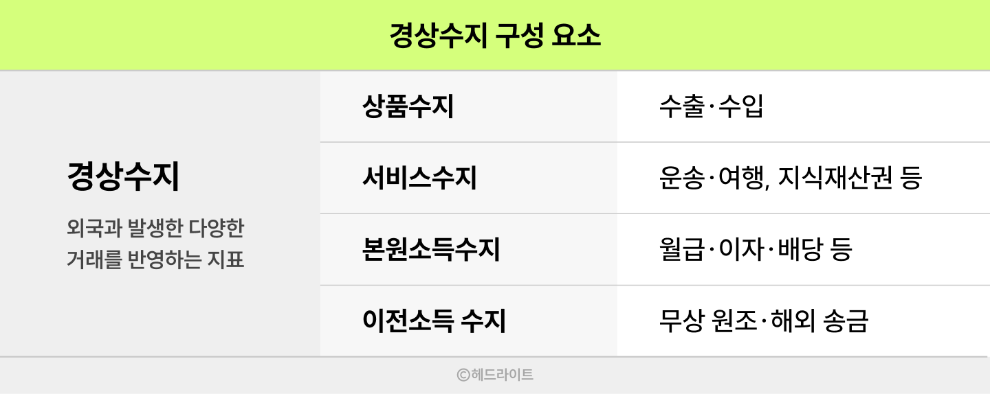 ๊ณผ ์ง์ถ'์ด๋ ๋ป์ด์์. ์ธ๊ตญ๊ณผ ๋ฐ์ํ ๋ค์ํ ๊ฑฐ๋๋ฅผ ๋ฐ์ํ๋ ์งํ์ธ๋ฐ์. ๊ฑฐ๋๋ ์ํ์ ์ฌ๊ณ ํ๋ ๊ฑฐ๋(=์ํ์์ง), ์ฌํ ๊ฐ์ ์๋น์ค๋ฅผ ์ฌ๊ณ ํ๋ ๊ฑฐ๋(=์๋น์ค์์ง), ์๊ธ·์ด์์ฒ๋ผ ์์ฐ ์์๋ฅผ ์ ๊ณตํ๊ณ ๋ฐ๋ ์๋ ๊ฑฐ๋(=๋ณธ์์๋์์ง), ์ฌ๋ ๊ตฌํธ๊ธ์ฒ๋ผ ๋๊ฐ ์์ด ์ฃผ๊ณ ๋ฐ๋ ์ด์ ๊ฑฐ๋(=์ด์ ์๋์์ง) ๋ฑ ๋ค์ํ์์์. ๊ฒฝ์์์ง๋ ์ด 4๊ฐ์ง๋ฅผ ํฉํ ๊ฑฐ์์. ๊ฒฝ์์์ง๊ฐ ํ์๋ฉด ๊ตญ๋ด๋ก ๋ค์ด์จ ๋์ด ๋ง์๊ณ , ์ ์๋ผ๋ฉด ํด์ธ๋ก ๋๊ฐ ๋์ด ๋ง์๋ค๋ ์๋ฆฌ์์.