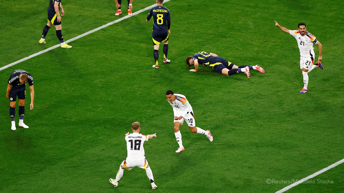 ์—‡๊ฐˆ๋ฆฐ ํฌ๋น„ | ์ง€๋‚œ 14์ผ, ์œ ๋Ÿฝ ๊ตญ๊ฐ€๋Œ€ํ‘œ ์ถ•๊ตฌ ๋Œ€ํšŒ์ธ UEFA ์œ ๋กœ 2024 ๊ฐœ๋ง‰ ๊ฒฝ๊ธฐ์—์„œ ์Šค์ฝ”ํ‹€๋žœ๋“œ๋ฅผ ์ƒ๋Œ€๋กœ ๊ณจ์„ ๋„ฃ์€ ๋…์ผ ์„ ์ˆ˜๋“ค์ด ํ™˜ํ˜ธํ•˜๊ณ  ์žˆ์–ด์š”.