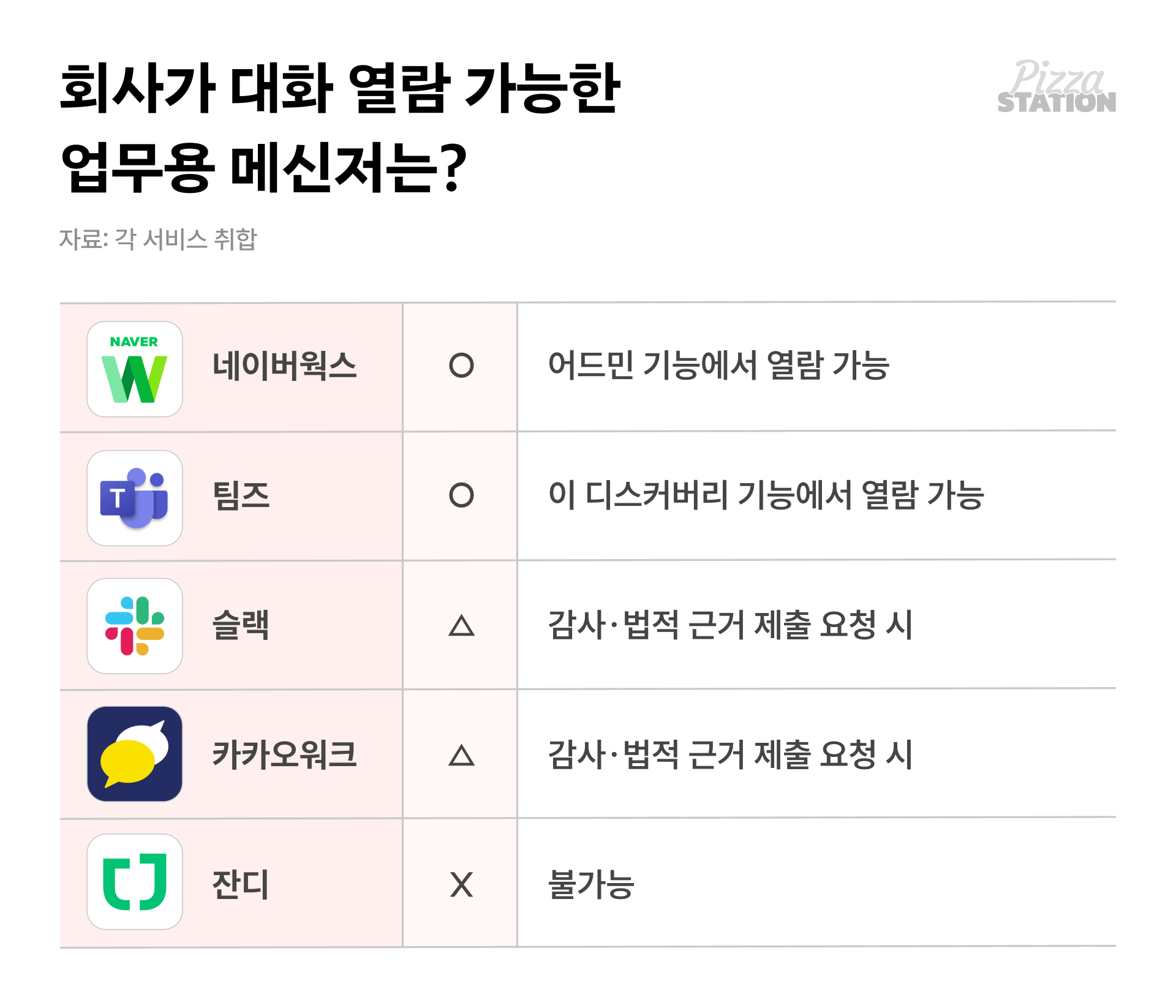 ๋ฉ”์‹ ์ €๋งˆ๋‹ค ์—ด๋žŒ ๊ฐ€๋Šฅ ์—ฌ๋ถ€๊ฐ€ ๋‹ค๋ฅธ๋ฐ์š”. ํŠน์ˆ˜ํ•œ ๊ฒฝ์šฐ์—๋งŒ ํ—ˆ์šฉํ•˜๋Š” ๊ฒƒ๊นŒ์ง€ ํฌํ•จํ•˜๋ฉด ๋Œ€๋ถ€๋ถ„ ํšŒ์‚ฌ๊ฐ€ ๋Œ€ํ™” ๋‚ด์—ญ์„ ์—ด์–ด๋ณผ ์ˆ˜ ์žˆ๋„๋ก ํ•ด๋†จ์–ด์š”. ๋„ค์ด๋ฒ„์›์Šค·ํŒ€์ฆˆ ๋“ฑ์˜ ๊ฒฝ์šฐ ๊ด€๋ฆฌ์ž ๊ธฐ๋Šฅ์„ ํ†ตํ•ด ํ™•์ธํ•  ์ˆ˜ ์žˆ๊ณ ์š”. ์Šฌ๋ž™·์นด์นด์˜ค์›Œํฌ ๋“ฑ์€ ๊ฐ์‚ฌ ๋˜๋Š” ๋ฒ•์  ๊ทผ๊ฑฐ ์ œ์ถœ์— ํ•„์š”ํ•œ ๊ฒฝ์šฐ์— ํ•œํ•ด ๋Œ€ํ™” ๋‚ด์—ญ์„ ์—ด๋žŒํ•  ์ˆ˜ ์žˆ์–ด์š”. ์ž”๋””๋Š” ์–ด๋–ค ์ƒํ™ฉ์—์„œ๋„ ๋ถˆ๊ฐ€๋Šฅํ•ด์š”.