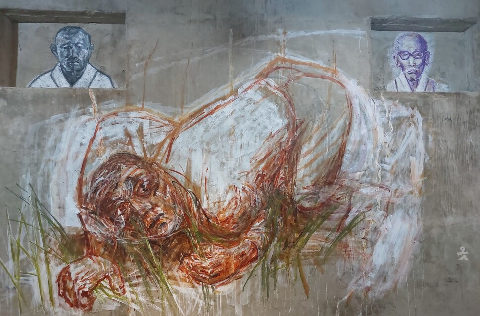 ๋ฒผ๋ฅผ ์ฅ” ์ฑ„ ์ฃฝ์–ด๊ฐ€๋Š” ๋‚จ์„ฑ์€ ์„œํƒœ์„์ž…๋‹ˆ๋‹ค. 1923๋…„ ์ „๋‚จ ์‹ ์•ˆ๊ตฐ์˜ ์„ฌ ์•”ํƒœ๋„์—์„œ ์นœ์ผ ์ง€์ฃผ์— ๋งž์„œ ์†Œ์ž‘๋ฃŒ ์ธํ•˜ ํˆฌ์Ÿ์„ ํ•œ ์ธ๋ฌผ์ธ๋ฐ์š”. 100๋…„ ๋งŒ์— ์•”ํƒœ๋„์˜ ์ฐฝ๊ณ ์— ๊ทธ์˜ ๊ทธ๋ฆผ์ด ์ „์‹œ๋์Šต๋‹ˆ๋‹ค.