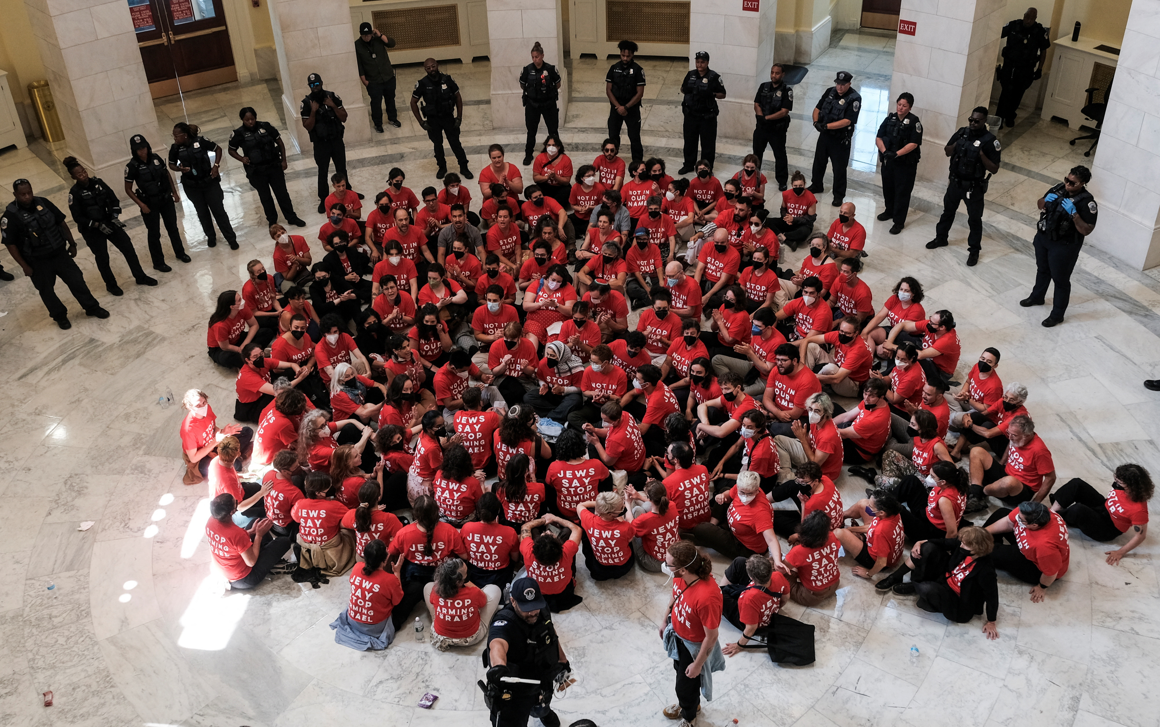 23์ผ ๋นจ๊ฐ„ ํ‹ฐ์…”์ธ ๋ฅผ ์ž…์€ ์‚ฌ๋žŒ๋“ค์ด ๋ฏธ๊ตญ ์—ฐ๋ฐฉํ•˜์› ์˜์›ํšŒ๊ด€ ๋ฐ”๋‹ฅ์— ๋น™ ๋‘˜๋Ÿฌ์•‰์•˜์Šต๋‹ˆ๋‹ค. ์—ฐ๋ฐฉ์˜ํšŒ ์—ฐ์„ค์„ ์•ž๋‘” ๋ฒ ๋ƒ๋ฏผ ๋„คํƒ€๋ƒํ›„ ์ด์Šค๋ผ์—˜ ์ด๋ฆฌ์—๊ฒŒ ๊ฐ€์ž ์ „์Ÿ ์ข…์‹์„ ์š”๊ตฌํ•˜๋ ค๊ณ  ๋ชจ์ธ ๊ฑด๋ฐ์š”. ์ด๋“ค์˜ ์˜ท์—” "(๋ฏธ๊ตญ์€) ์ด์Šค๋ผ์—˜์— ๋ฌด๊ธฐ ์ˆ˜์ถœ์„ ํ•˜์ง€ ๋ง๋ผ"๊ณ ๋„ ์“ฐ์—ฌ์žˆ์Šต๋‹ˆ๋‹ค.
