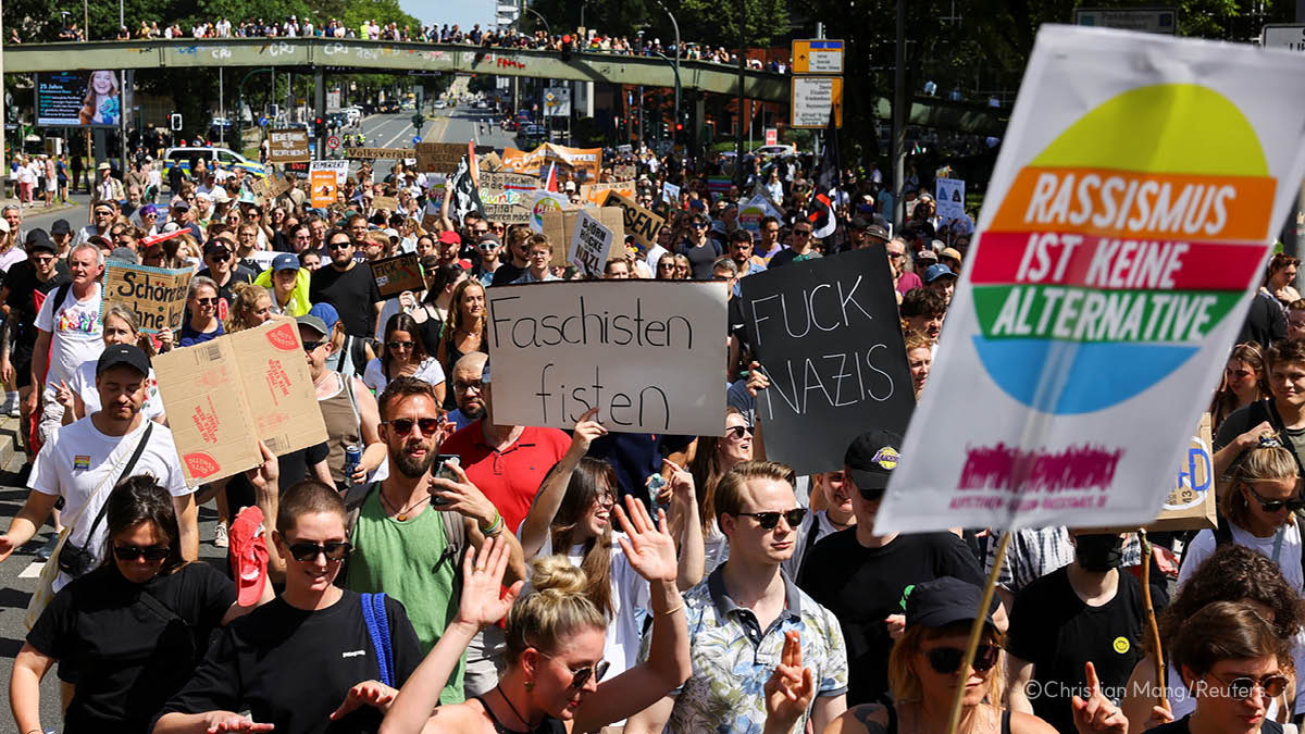 "F*** AfD" |  ๋…์ผ ๊ทน์šฐ ์ •๋‹น '๋…์ผ์„ ์œ„ํ•œ ๋Œ€์•ˆ(AfD)' ์ „๋‹น๋Œ€ํšŒ๊ฐ€ ์—ด๋ฆฐ ํ–‰์‚ฌ์žฅ ์ธ๊ทผ์—์„œ ์‹œ๋ฏผ๋“ค์ด '์ธ์ข…์ฃผ์˜๋Š” ๋Œ€์•ˆ์ด ์•„๋‹ˆ๋‹ค!' ๋“ฑ์˜ ๋ฌธ๊ตฌ๊ฐ€ ์ ํžŒ ํ”ผ์ผ“์„ ๋“ค๊ณ  ๋ฐ˜๋Œ€ ์‹œ์œ„๋ฅผ ๋ฒŒ์ด๊ณ  ์žˆ์–ด์š”.