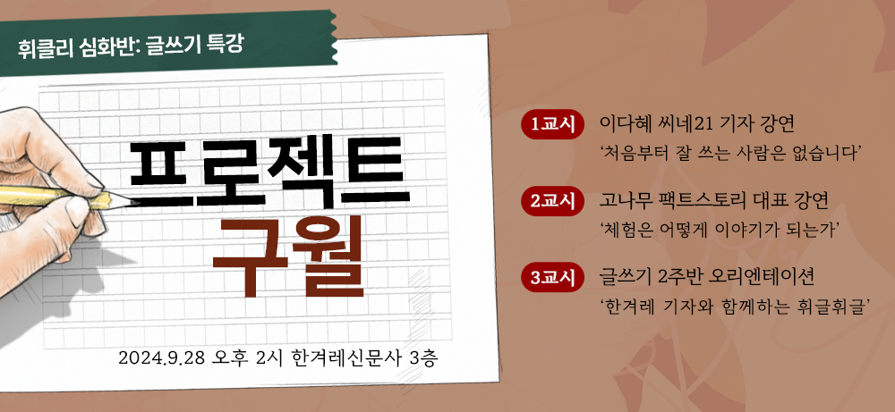 ํ•œ๊ฒจ๋ ˆ ๊ธฐ์ž์™€ ํ•จ๊ป˜ํ•˜๋Š” 'ํœ˜๊ธ€ํœ˜๊ธ€'(์†Œ์„ค·์—์„ธ์ด·์ž์†Œ์„œ๋ฐ˜ ์ค‘ ์„ ํƒ)