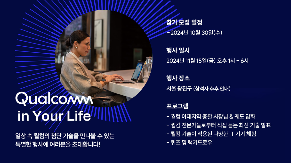 ๋๋๊ณค ์ธ์ฌ์ด๋์ฆ๋ง์ ์ํ ํน๋ณํ ํ์ฌ, ํ์ปด ์ธ ์ ์ด ๋ผ์ดํ(Qualcomm In Your Life)'๊ฐ ๊ธฐ๋ค๋ฆฌ๊ณ ์๋๋ฐ์. ์ด๋ฒ ํ์ฌ์์๋ ๊ถ์คํ ํ์ปด ์์์ ํํ์ ์ง์ญ ์ด๊ด ์ฌ์ฅ๊ณผ ๊ณผํ ์ปค๋ฎค๋์ผ์ดํฐ ๊ถค๋์ ๋ดํ๋ฅผ ํตํด AI∙์์จ์ฃผํ ์๋์ฐจ∙XR∙IoT ๋ฑ ์ฒจ๋จ ๊ธฐ์ ์ด ์ฐ๋ฆฌ์ ์ผ์์ ์ด๋ป๊ฒ ๋ณํ์ํค๋์ง ์์๋ณผ ์ ์๊ณ ์ ๐ค✨. ํ์ปด ์ ๋ฌธ๊ฐ๋ค์ด ์งํํ๋ ๊ธฐ์ ์๊ฐ ์ธ์