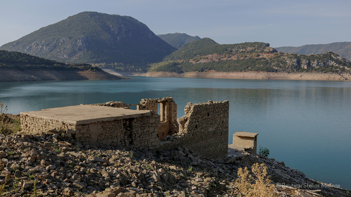45๋…„ ๋งŒ์— ๋“œ๋Ÿฌ๋‚œ ๋งˆ์„ | ๊ทธ๋ฆฌ์Šค์—์„œ ์ตœ์•…์˜ ๊ฐ€๋ญ„์ด ์ด์–ด์ง€๊ณ  ์žˆ์–ด์š”. ์‚ฌ์ง„์€ ๊ฐ€๋ญ„์œผ๋กœ ์ €์ˆ˜์ง€ ์ˆ˜์œ„๊ฐ€ ๋‚ฎ์•„์ง€๋ฉด์„œ ๋Œ ๊ฑด์„ค๋กœ ์ˆ˜๋ชฐ๋๋˜ ๋งˆ์„์ด ๋ฌผ ๋ฐ–์œผ๋กœ ๋‚˜์˜จ ๋ชจ์Šต์ด์—์š”.