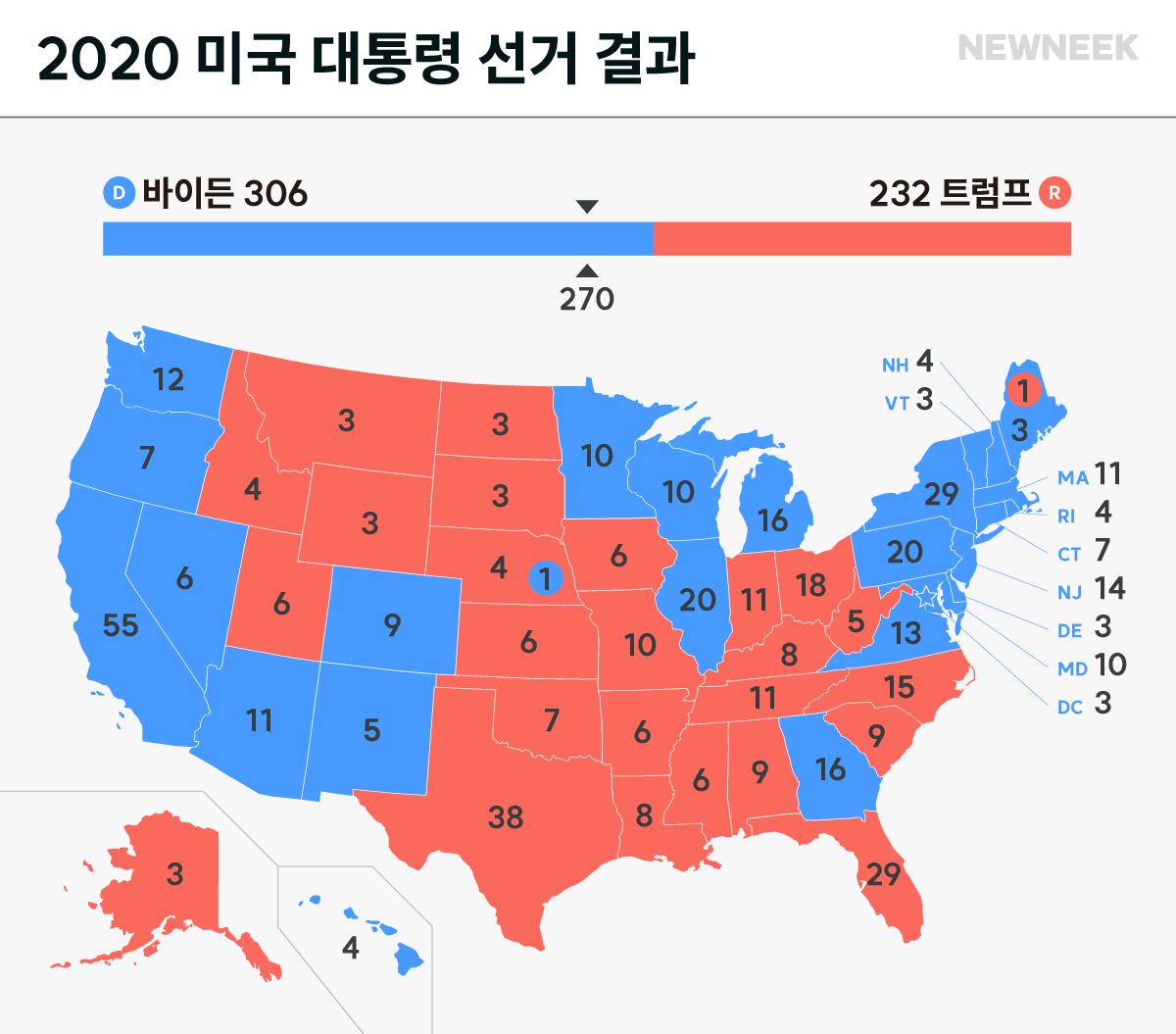 • ๋งค์ง๋„˜๋ฒ„ 270 ✨: ๋”ฐ๋ผ์„œ ๋ฏธ๊ตญ์—์„œ๋Š” ์ „์ฒด ์œ ๊ถŒ์ž๋“ค์˜ ํ‘œ(popular vote)๋ฅผ ๋งŽ์ด ์–ป๋Š” ํ›„๋ณด๊ฐ€ ์ด๊ธฐ๋Š” ๊ฒŒ ์•„๋‹ˆ๋ผ, ์„ ๊ฑฐ์ธ๋‹จ์„ ๋” ๋งŽ์ด ํ™•๋ณดํ•œ ํ›„๋ณด๊ฐ€ ๋Œ€ํ†ต๋ น·๋ถ€ํ†ต๋ น์ด ๋ผ์š”. 538๋ช…์˜ ๊ณผ๋ฐ˜์ธ 270๋ช… ๋„˜๋Š” ์„ ๊ฑฐ์ธ๋‹จ์„ ํ™•๋ณดํ•˜๋ฉด ์Šน๋ฆฌํ•˜๋Š” ๊ฒƒ. 2016๋…„ ๋Œ€์„ ์—์„œ ๋ฏผ์ฃผ๋‹น ํž๋Ÿฌ๋ฆฌ ํด๋ฆฐํ„ด ํ›„๋ณด๋Š” ๊ณตํ™”๋‹น ๋„๋„๋“œ ํŠธ๋Ÿผํ”„ ํ›„๋ณด๋ณด๋‹ค ํ‘œ๋ฅผ 286๋งŒ ํ‘œ๋‚˜ ๋” ๋งŽ์ด ์–ป์—ˆ๋Š”๋ฐ์š”. ์„ ๊ฑฐ์ธ๋‹จ ์ˆ˜์—์„œ๋Š” 232๋ช… ๋Œ€ 306๋ช…์œผ๋กœ ๋ฐ€๋ ค์„œ ์„ ๊ฑฐ์—์„œ ์กŒ์–ด์š”.