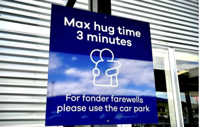 ๋‰ด์งˆ๋žœ๋“œ ๋”๋‹ˆ๋“ ๊ตญ์ œ๊ณตํ•ญ์— ์„ค์น˜๋œ ์•ˆ๋‚ดํŒ์ž…๋‹ˆ๋‹ค. ์‚ฌ๋žŒ๋“ค์ด ์ฐจ์—์„œ ๋‚ด๋ฆฌ๋Š” ๊ณตํ•ญ ์ž…๊ตฌ์— ๋‚ด๊ฑธ๋ ธ๋Š”๋ฐ์š”. '์ตœ๋Œ€ ํฌ์˜น ์‹œ๊ฐ„ 3๋ถ„'์ด๋ผ๊ณ  ์ ํ˜€์žˆ์Šต๋‹ˆ๋‹ค. ๋” ์• ํ‹‹ํ•œ ์ž‘๋ณ„์„ ์›ํ•œ๋‹ค๋ฉด ๊ตํ†ต ํ๋ฆ„์„ ๋ฐฉํ•ดํ•˜์ง€ ์•Š๋Š” ์—ฌ๊ธฐ๋กœ ๊ฐ€๋ผ๊ณ  ์•ˆ๋‚ดํ•ฉ๋‹ˆ๋‹ค.๐Ÿ‘‰๊ธฐ์‚ฌ๋ณด๊ธฐ