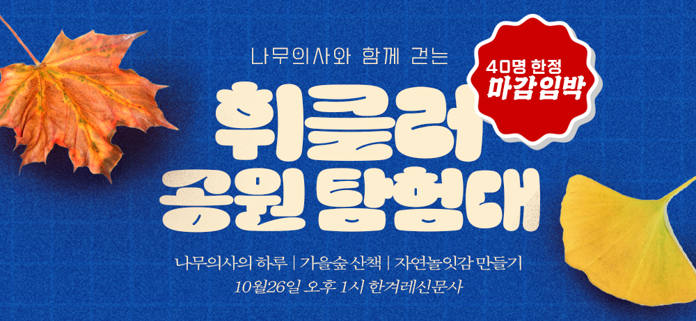 ๊ฐ€์„์ด ๊ฐ€๋ฒ„๋ฆฌ๊ธฐ ์ „์—, ๋‚˜๋ฌด์˜์‚ฌ์™€ ํ•จ๊ป˜ ๋‚˜๋“ค์ด๋ฅผ ๋– ๋‚˜์š”. ์†”๋ฐฉ์šธ ์š”์š”๋ฅผ ๋งŒ๋“ค์–ด ํ•จ๊ป˜ ๋†€์•„๋„ ๋ณด๊ณ ์š”. ๋‹ค ์ค€๋น„๋ผ ์žˆ์œผ๋‹ˆ, ํŽธํ•œ ์‹ ๋ฐœ๋งŒ ์‹ ๊ณ  ์˜ค์‹œ๋ฉด ๋ฉ๋‹ˆ๋‹ค!