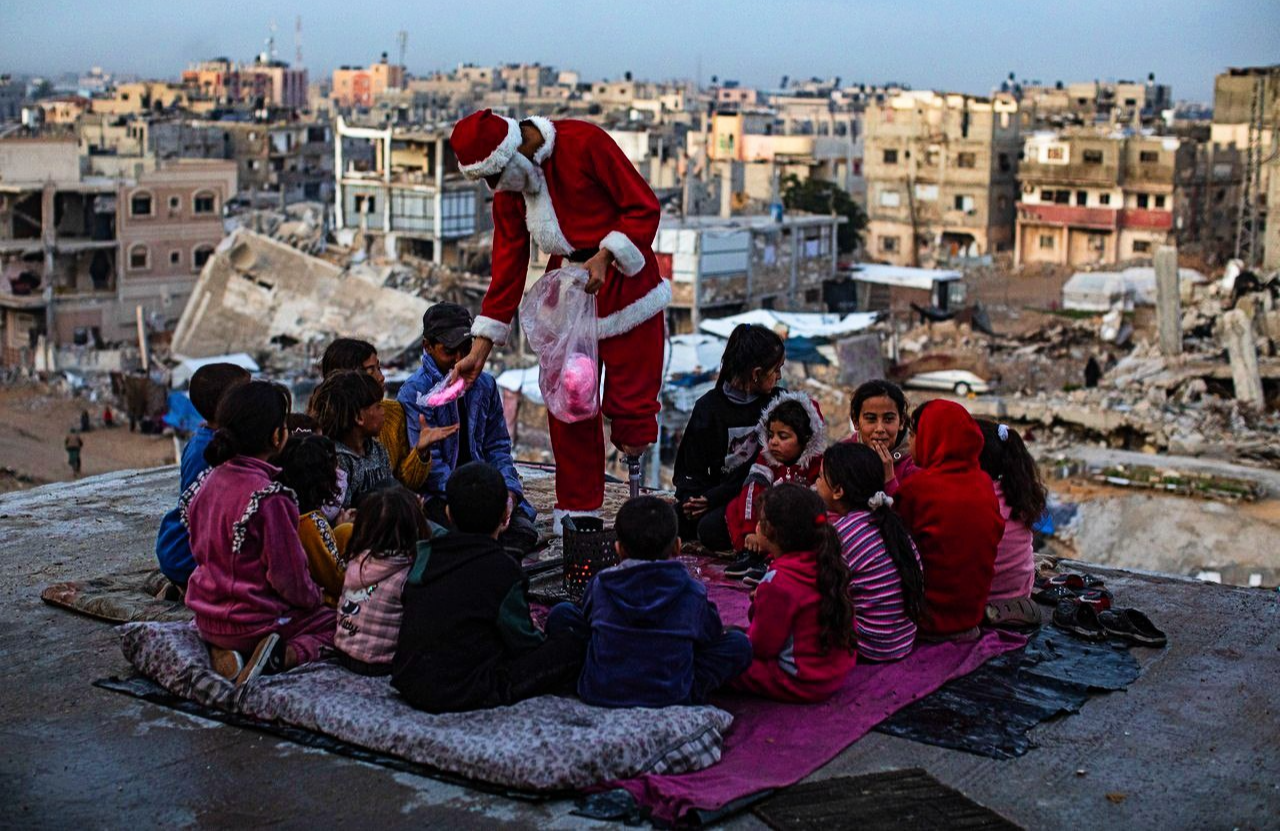 5์ผ(ํ˜„์ง€์‹œ๊ฐ) ํŒ”๋ ˆ์Šคํƒ€์ธ ๊ฐ€์ž์ง€๊ตฌ์˜ ๋ถ€์„œ์ง„ ๊ฑด๋ฌผ ์ง€๋ถ•์—์„œ ์•„์ด๋“ค์—๊ฒŒ ์‚ฌํƒ•์„ ๋‚˜๋ˆ ์ฃผ๋Š” ์‚ฐํƒ€๋Š” 26์‚ด ์˜ค๋งˆ๋ฅด์ž…๋‹ˆ๋‹ค. ์ „์Ÿ์œผ๋กœ ํ•œ์ชฝ ๋‹ค๋ฆฌ๋ฅผ ์žƒ์€ ๋’ค ์˜์กฑ์„ ํ•œ ์˜ค๋งˆ๋ฅด๋Š” ์ •๊ตํšŒ ์„ฑํƒ„์ ˆ์„ ์•ž๋‘๊ณ  ์•„์ด๋“ค์—๊ฒŒ ์‚ฌ๋ž‘๊ณผ ๊ธฐ์จ์„ ์ „ํ–ˆ์Šต๋‹ˆ๋‹ค.