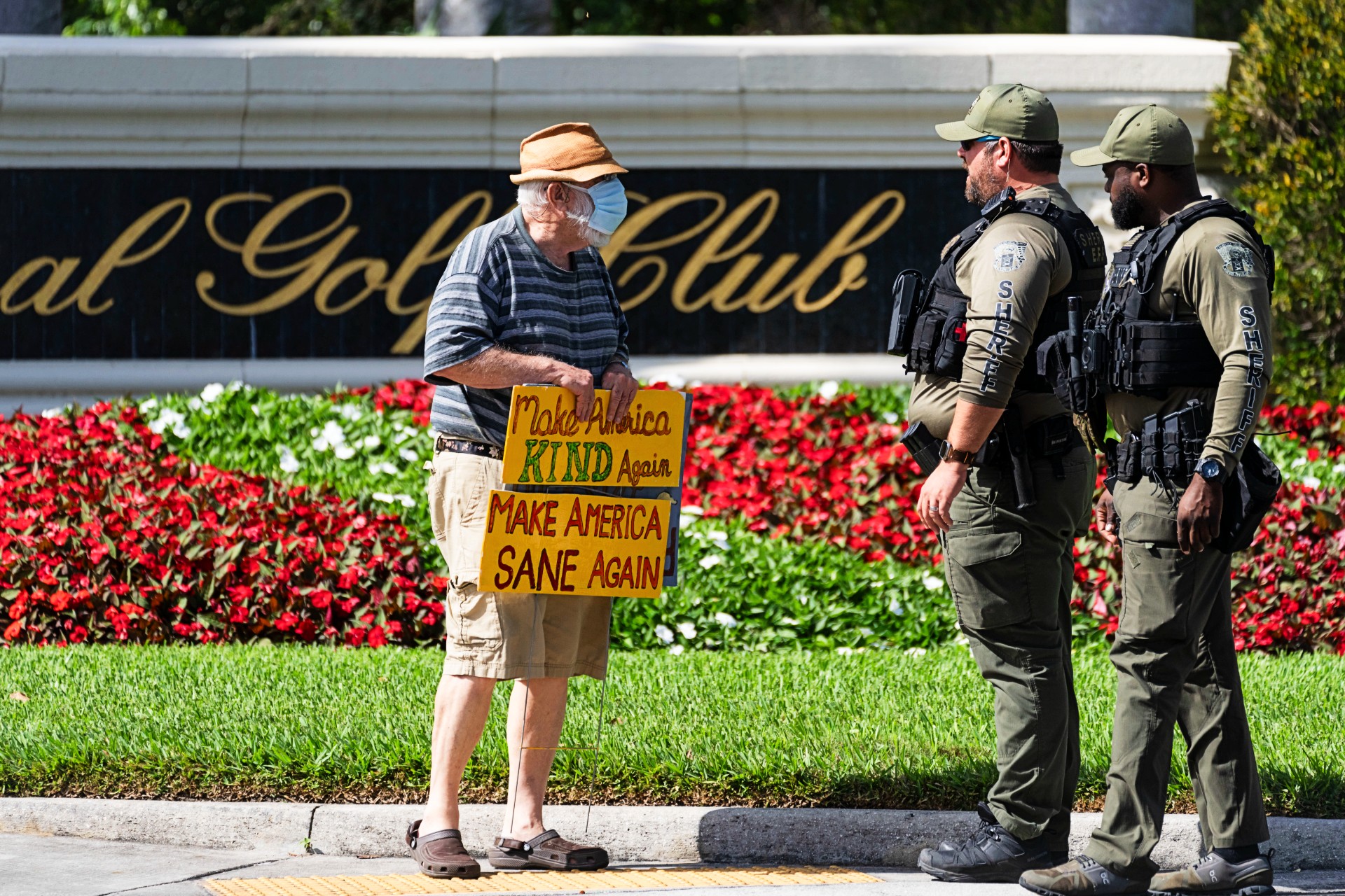 15์ผ(ํ˜„์ง€์‹œ๊ฐ) ๋ฏธ๊ตญ ํ”Œ๋กœ๋ฆฌ๋‹ค์ฃผ ์›จ์ŠคํŠธ ํŒœ๋น„์น˜์— ์žˆ๋Š” 'ํŠธ๋Ÿผํ”„ ์ธํ„ฐ๋‚ด์…”๋„ ๊ณจํ”„ํด๋Ÿฝ'์„ ์ฃผ๋ฏผ ๋กœ๋ฒ„ํŠธ ํ˜ธ๋ (82)์ด ์ฐพ์•˜์Šต๋‹ˆ๋‹ค. ๊ทธ์˜ ์†์—” '๋ฏธ๊ตญ์„ ๋‹ค์‹œ ์ œ์ •์‹ ์œผ๋กœ'(Make America Sane Again)๋ผ๊ณ  ์“ฐ์ธ ์†ํŒป๋ง์ด ๋“ค๋ ค ์žˆ๋Š”๋ฐ์š”. '๋ฏธ๊ตญ์„ ๋‹ค์‹œ ์œ„๋Œ€ํ•˜๊ฒŒ'๋ผ๋Š” ๋œป์˜ ํŠธ๋Ÿผํ”„์˜ ์Šฌ๋กœ๊ฑด '๋งˆ๊ฐ€'(Make America Great Again)๋ฅผ ๋น„ํŠผ ๋ฌธ๊ตฌ์ž…๋‹ˆ๋‹ค.