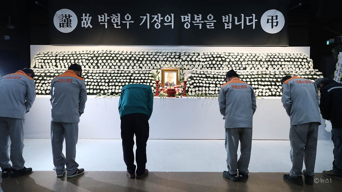์‚ฐ๋ถˆ ์ง„ํ™” ํ—ฌ๊ธฐ ์ถ”๋ฝํ•ด ์ˆœ์งํ•œ ์กฐ์ข…์‚ฌ  | ์ง€๋‚œ 28์ผ ์˜ค์ „ ๊ณ (ๆ•…) ๋ฐ•ํ˜„์šฐ ๊ธฐ์žฅ์˜ ๋ถ„ํ–ฅ์†Œ๋ฅผ ์ฐพ์€ ์†Œ๋ฐฉ๋Œ€์›๋“ค์ด ์• ๋„๋ฅผ ํ‘œํ•˜๊ณ  ์žˆ์–ด์š”. ๊ณ ์ธ์€ ๊ฒฝ๋ถ ์˜์„ฑ ์‚ฐ๋ถˆ์„ ์ง„ํ™”ํ•˜๊ธฐ ์œ„ํ•ด ์ถœ๋™ํ–ˆ๋‹ค๊ฐ€ ํ—ฌ๊ธฐ๊ฐ€ ์ถ”๋ฝํ•ด ์‚ฌ๋งํ–ˆ์–ด์š”. ๊ฐ€์กฑ๊ณผ ๋™๋ฃŒ๋“ค์€ "์‚ฌ๋ช…๊ฐ์ด ํˆฌ์ฒ ํ–ˆ๋˜ ๋ฒ ํ…Œ๋ž‘ ๊ธฐ์žฅ์ด์—ˆ๋‹ค"๋ฉฐ ๊ณ ์ธ์„ ์ถ”๋ชจํ–ˆ์–ด์š”.