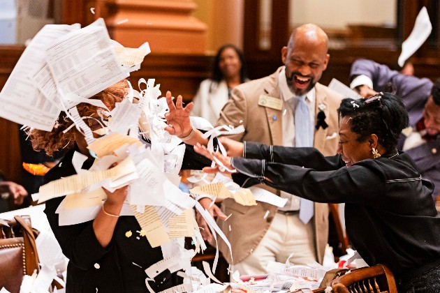 ์ฐข์–ด์ง„ ์ข…์ด๋ฅผ ๋˜์ง€๊ณ  ์žˆ๋Š”๋ฐ ๊ธฐ๋ถ„์ด ์ข‹์•„ ๋ณด์ด์ฃ ? ์ง€๋‚œ 4์ผ(ํ˜„์ง€์‹œ๊ฐ) ๋ฏธ๊ตญ ์กฐ์ง€์•„์ฃผ ์ฃผ์˜ํšŒ ์˜์‚ฌ๋‹น์˜ ๋ชจ์Šต์ธ๋ฐ์š”. ์กฐ์ง€์•„์ฃผ ์ฃผ์˜ํšŒ๋Š” ํšŒ๊ธฐ ๋งˆ์ง€๋ง‰ ๋‚ ์„ '์‹œ๋„ค ๋””์—(Sine Die)'๋ผ๊ณ  ๋ถ€๋ฅด๋Š”๋ฐ, ์ด๋• ์„œ๋ฅ˜๋ฅผ ์ฐข๊ฑฐ๋‚˜ ๋˜์ ธ ํšŒ๊ธฐ์˜ ์ข…๋ฃŒ๋ฅผ ์ถ•ํ•˜ํ•˜๋Š” ๊ด€์Šต์ด ์žˆ๋‹ค๊ณ  ํ•˜๋„ค์š”.