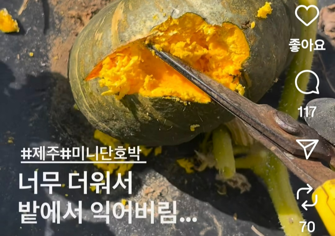 ์ œ์ฃผ๋„ ๋ฐฉ์–ธ์œผ๋กœ '๋„ˆ๋ฌด ๋ฅ๋‹ค'๋Š” ๋œป์ž…๋‹ˆ๋‹ค. ์ œ์ฃผ ํ•œ๊ฒฝ๋ฉด ๋†์žฅ์—์„  ์ž˜ ์ž๋ผ๋˜ ๋‹จํ˜ธ๋ฐ•์ด ๋”์œ„์— ์ต์–ด๋ฒ„๋ ธ๋Š”๋ฐ์š”. ์ฃผ๋ณ€ ๊ณ ์‚ฐ์ง€๋Œ€๋„ ๋‚ฎ ์ตœ๊ณ  30๋„๊นŒ์ง€ ์˜ค๋ฅผ ์ •๋„๋กœ ์‹ฌํ•œ ๋”์œ„์— ๋†์ž‘๋ฌผ์ด ๋ง ๊ทธ๋Œ€๋กœ ํƒ€๋“ค์–ด๊ฐ€๊ณ  ์žˆ์Šต๋‹ˆ๋‹ค.(์ œ์ฃผ๋ณผ๋ ˆ์„ฌ๋†์žฅ)