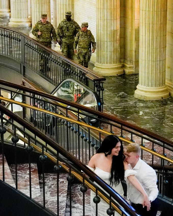 16์ผ(ํ˜„์ง€์‹œ๊ฐ) ๋ฏธ๊ตญ ์›Œ์‹ฑํ„ดDC ์œ ๋‹ˆ์˜จ ์—ญ์—์„œ ์•ฝํ˜ผ ์‚ฌ์ง„์„ ์ฐ๋Š” ์—ฐ์ธ ๋’ค๋กœ ์ปฌ๋Ÿผ๋น„์•„ ์ฃผ๋ฐฉ์œ„๊ตฐ ๊ตฐ์ธ๋“ค์ด ๋‚ด๋ถ€๋ฅผ ์ˆœ์ฐฐํ•˜๊ณ  ์žˆ์Šต๋‹ˆ๋‹ค. ํŠธ๋Ÿผํ”„ ๋ฏธ ๋Œ€ํ†ต๋ น์€ 11์ผ ํ–‰์ •๋ช…๋ น์œผ๋กœ ๋…ธ์ˆ™์ธ๊ณผ ๋ฒ”์ฃ„ ๋‹จ์†์„ ์œ„ํ•ด ์ฃผ๋ฐฉ์œ„๊ตฐ์„ ๋ฐฐ์น˜ํ–ˆ์Šต๋‹ˆ๋‹ค. ์›๋ž˜ ์›Œ์‹ฑํ„ดDC๋Š” ์ปฌ๋Ÿผ๋น„์•„ ํŠน๋ณ„์ž์น˜๊ตฌ๋กœ ์ž์น˜ ๊ฒฝ์ฐฐ์„ ๋‘๊ณ  ์žˆ์Šต๋‹ˆ๋‹ค. ๋ฐฑ์•…๊ด€ ์ฃผ๋ณ€์—๋Š” ์ด๋Ÿฐ ๋ฏผ์ฃผ์ฃผ์˜ ํ›„ํ‡ด๋ฅผ ๊ทœํƒ„ํ•˜๋Š” ์‹œ์œ„๊ฐ€ ๋ฒŒ์–ด์ง‘๋‹ˆ๋‹ค. ๊ทธ๊ณณ์—๋„ ์ฃผ๋ฐฉ์œ„๊ตฐ์ด ์ถœ๋™ํ•ฉ๋‹ˆ๋‹ค.