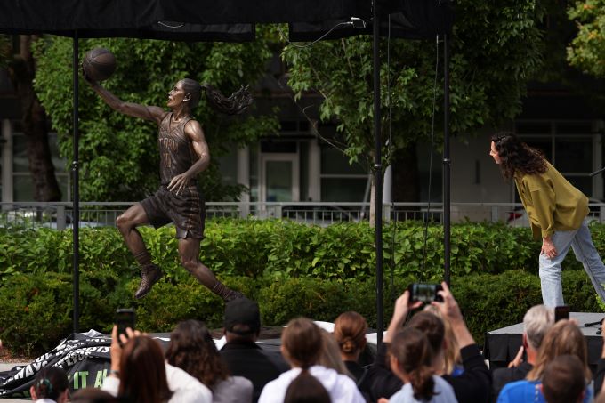 17์ผ(ํ˜„์ง€์‹œ๊ฐ) ๋ฏธ๊ตญ ์›Œ์‹ฑํ„ด์ฃผ ์‹œ์• ํ‹€ ๊ธฐํ›„์„œ์•ฝ ๊ฒฝ๊ธฐ์žฅ ์•ž์—์„œ ๋ฉ‹์ง€๊ฒŒ ๋‚ ์•„์˜ฌ๋ผ ์˜ค๋ฅธ์† ๋ ˆ์ด์—… ์Š› ํ•˜๋Š” ๋™์ƒ์„ ๋ณด๋Š” ์‚ฌ๋žŒ๋“ค์ž…๋‹ˆ๋‹ค. ๋™์ƒ์˜ ์ฃผ์ธ๊ณต์ธ ์ „ ๋ฏธ๊ตญ์—ฌ์žํ”„๋กœ๋†๊ตฌ(WNBA) ์„ ์ˆ˜ '์ˆ˜ ๋ฒ„๋“œ'๋„ ๋‹จ์ƒ ์œ„์—์„œ ํ•จ๊ป˜ ๋ฐ”๋ผ๋ณด๋Š” ์ค‘์ธ๋ฐ์š”. WNBA ์ตœ์ดˆ๋กœ ๋™์ƒ์„ ํ—Œ์ •๋ฐ›์€ ๊ทธ๋Š” ์‹ ์ธ ๋•Œ ์ฒซ ๋“์ ๊ณผ ์€ํ‡ด ์ „ ๋งˆ์ง€๋ง‰ ๋“์ ์ด ๋ชจ๋‘ ๋ ˆ์ด์—… ์Š›์ด์—ˆ๋‹ค๋„ค์š”.
