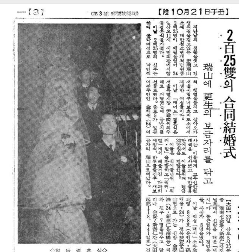 ์‚ฌ์ง„์€ 1964๋…„์˜ ์„œ์‚ฐ๊ฐœ์ฒ™๋‹จ 2์ฐจ ํ•ฉ๋™๊ฒฐํ˜ผ์‹์„ ๋ณด๋„ํ•œ ์‚ฌ์ง„์ž…๋‹ˆ๋‹ค. ์ •๋ถ€ ์ฃผ๋„์˜ ์ง‘๋‹จ์ˆ˜์šฉ์‹œ์„ค ์„œ์‚ฐ๊ฐœ์ฒ™๋‹จ์ด ์žˆ๋˜ ์ž๋ฆฌ์—์„œ ๋งŒ๋‚œ ์ •ํฌ์”จ๋Š” ๋ถ€๋…€๋ณดํ˜ธ์†Œ์—์„œ ์„œ์‚ฐ์œผ๋กœ ๋Œ๋ ค๊ฐ€ ๋ฐ˜์ธ๊ถŒ์  ๊ฒฐํ˜ผ์‹์„ ํ•œ ๊ณผ๊ฑฐ๋ฅผ ๋“ค๋ ค์ฃผ์—ˆ์Šต๋‹ˆ๋‹ค. ๊ทธ๋Š” ๋‹น์‹œ ๊ฐ•์ œ๊ฒฐํ˜ผ์‹์„ ๋‹นํ•œ 225๋ช… ์ค‘ ์–ธ๋ก ์— ์ž์‹ ์„ ๋“œ๋Ÿฌ๋‚ธ ์ฒซ ํ”ผํ•ด ์—ฌ์„ฑ์ž…๋‹ˆ๋‹ค.๐Ÿ‘‰๊ธฐ์‚ฌ ๋ณด๊ธฐ