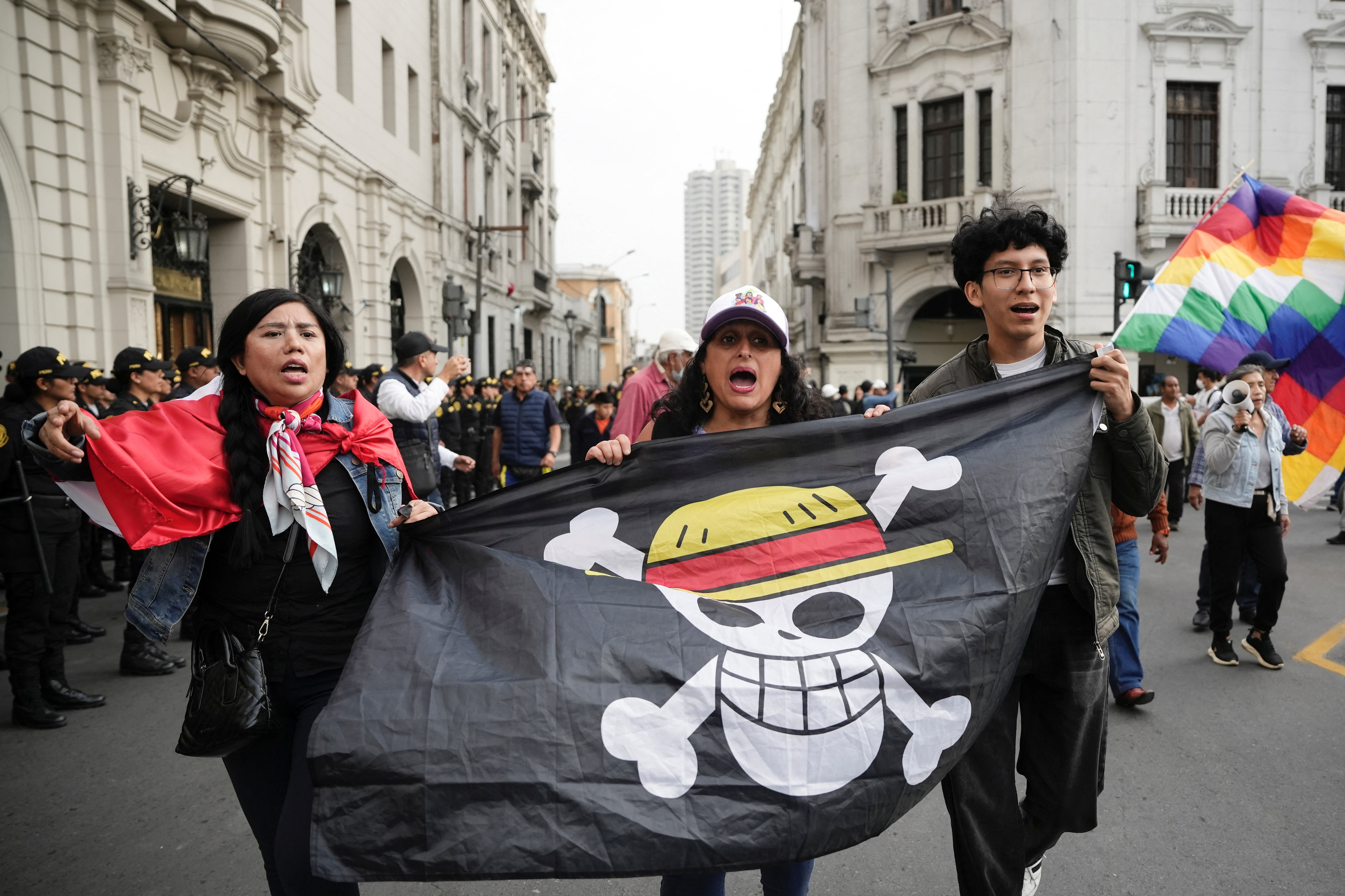 ์ง€๋‚œ 20์ผ(ํ˜„์ง€์‹œ๊ฐ) ํŽ˜๋ฃจ ๋ฆฌ๋งˆ์—๋„ ๋งŒํ™” '์›ํ”ผ์Šค'์˜ ํ•ด๊ณจ ๋ฌธ์–‘ ๊นƒ๋ฐœ์ด ๋“ฑ์žฅํ–ˆ์Šต๋‹ˆ๋‹ค. ํŽ˜๋ฃจ ๊ตญํšŒ๊ฐ€ ๊ฐœ์ธ์—ฐ๊ธˆ์„ ์กฐ๊ธฐ์— ์ธ์ถœํ•  ์ˆ˜ ์žˆ๋„๋ก ํ—ˆ์šฉํ•˜์ž, ์‹œ๋ฏผ๋“ค์ด ๋ฏธ๋ž˜๋ฅผ ๋” ๋ถˆ์•ˆํ•˜๊ฒŒ ํ•˜๋Š” ์ •์ฑ…์— ํ•ญ์˜ํ•˜๋ฉฐ ๊ฑฐ๋ฆฌ๋กœ ๋‚˜์˜จ ๊ฑด๋ฐ์š”. ์ง€๋‚œ๋‹ฌ ์ธ๋„๋„ค์‹œ์•„ ์‹œ์œ„ ์ดํ›„ ์›ํ”ผ์Šค ๊นƒ๋ฐœ์€ ๋ฐ˜์ •๋ถ€, ๋ฐ˜๊ถŒ์œ„์ฃผ์˜ ์šด๋™์˜ ์ƒ์ง•์ด ๋˜๊ณ  ์žˆ์Šต๋‹ˆ๋‹ค.