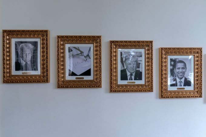 27์ผ(ํ˜„์ง€์‹œ๊ฐ) ๋ฏธ๊ตญ ์›Œ์‹ฑํ„ด ๋ฐฑ์•…๊ด€ ์›จ์ŠคํŠธ์œ™ ํšŒ๋ž‘ ๋ชจ์Šต์ž…๋‹ˆ๋‹ค. 24์ผ ๊ณต๊ฐœ๋œ ๋Œ€ํ†ต๋ น ๋ช…์˜ˆ์˜ ๊ฑฐ๋ฆฌ๋Š” 45๋ช… ๋Œ€ํ†ต๋ น ์–ผ๊ตด ์‚ฌ์ง„์œผ๋กœ ๊พธ๋ฉฐ์กŒ๋Š”๋ฐ์š”, ์กฐ ๋ฐ”์ด๋“  ์ „ ๋Œ€ํ†ต๋ น ์ž๋ฆฌ์—๋Š” '์˜คํ† ํŽœ'(์ž๋™ ์„œ๋ช…๊ธฐ) ์‚ฌ์ง„์ด ๊ฑธ๋ ธ์Šต๋‹ˆ๋‹ค. ์˜คํ† ํŽœ์€ ๊ตญํšŒ์™€ ๋ฐฑ์•…๊ด€์˜ ํ”ํ•œ ์„œ๋ช… ๋ฐฉ์‹์ด์ง€๋งŒ, ํŠธ๋Ÿผํ”„๋Š” ๋ฐ”์ด๋“ ์ด ์ž„๊ธฐ ๋ง ์ œ๋Œ€๋กœ ๋œ ์˜์‚ฌ ๊ฒฐ์ •์„ ํ•˜์ง€ ์•Š์•˜๋‹ค๋Š” ๋น„๋‚œ์˜ ๊ทผ๊ฑฐ๋กœ ์ด์šฉํ•ด์™”์Šต๋‹ˆ๋‹ค.