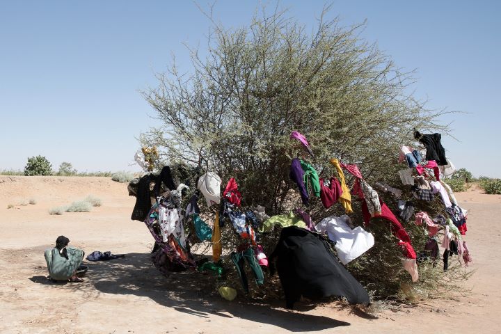 16์ผ(ํ˜„์ง€์‹œ๊ฐ) ์ผ์š”์ผ, ์ˆ˜๋‹จ ๋ถ๋ถ€ ํ•œ ๋‚œ๋ฏผ ์บ ํ”„ ๋‚˜๋ฌด์— ๋„์–ด๋†“์€ ๋นจ๋ž˜์ž…๋‹ˆ๋‹ค. ์ง€๋‚œ๋‹ฌ 26์ผ ๋ฐ˜๊ตฐ ์‹ ์†์ง€์›๊ตฐ(RSF)์ด ์ •๋ถ€๊ตฐ ์„œ๋ถ€ ์ตœํ›„ ๊ฑฐ์ ์ด๋˜ ์•ŒํŒŒ์‹œ๋ฅด๋ฅผ ์ ๋ นํ•˜์ž ๋‚œ๋ฏผ๋“ค์€ ์ด๊ณณ์œผ๋กœ ํ”ผ๋‚œํ–ˆ์Šต๋‹ˆ๋‹ค. ์บ ํ”„์—๋Š” ์‹๋Ÿ‰, ์˜์•ฝํ’ˆ์ด ๋ชจ๋‘ ํ„ฑ์—†์ด ๋ถ€์กฑํ•ฉ๋‹ˆ๋‹ค. ๊ตญ๊ฒฝ์—†๋Š”์˜์‚ฌํšŒ๋Š” 5์‚ด ๋ฏธ๋งŒ ์•„๋™ 70%๊ฐ€ ๊ธ‰์„ฑ ์˜์–‘์‹ค์กฐ ์ƒํƒœ๋ผ๊ณ  ๊ฒฝ๊ณ ํ•ฉ๋‹ˆ๋‹ค.