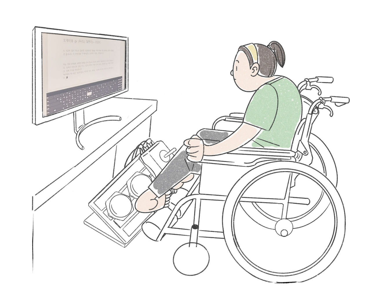 ์ฑ…์— ๋‚˜์˜ค๋Š” ์ค‘์ฆ์žฅ์• ์ธ ์กฐ์ƒ์ง€์”จ๋Š” ์‹œ์„ค์— ์žˆ์„ ๋•Œ์˜ ์‚ถ์„ "์ธ์ƒ์˜ ํ•œ ๊ตฌ๊ฐ„์ด ๋œ์–ด๋‚ด์ง„ ๊ฒƒ์ฒ˜๋Ÿผ ๋น„์–ด ์žˆ๋Š”" ์‚ถ์ด์—ˆ๋‹ค๊ณ  ํ‘œํ˜„ํ•ฉ๋‹ˆ๋‹ค. "์‹œ์„ค์—์„œ๋Š” ์ƒ๊ฐํ•  ํ•„์š”๊ฐ€ ์—†์–ด์š”. ์ •ํ•ด์ค€ ๊ฒƒ๋งŒ ํ•˜๋ฉด ๋˜๋‹ˆ๊นŒ์š”. ๋จน๊ณ  ์‹ถ์€ ๊ฑธ ์ƒ๊ฐํ•  ํ•„์š”๋„ ์—†์–ด์š”. ์–ด์ฐจํ”ผ ๋จน์„ ์ˆ˜ ์—†์œผ๋‹ˆ๊นŒ์š”." ์กฐ์ƒ์ง€์”จ์˜ ๋ง์ž…๋‹ˆ๋‹ค. ์กฐ์ƒ์ง€์”จ๋Š” ์ง€๊ธˆ์€ ์‹œ์„ค์—์„œ ๋‚˜์™€ ์•„๋ž˜ ๊ทธ๋ฆผ์ฒ˜๋Ÿผ ๋ฐœ๋กœ ํƒ€์ดํ•‘ํ•ด ์ž๊ธฐ ์ƒ๊ฐ์„ ๊ธ€๋กœ ํ‘œํ˜„ํ•ฉ๋‹ˆ๋‹ค.