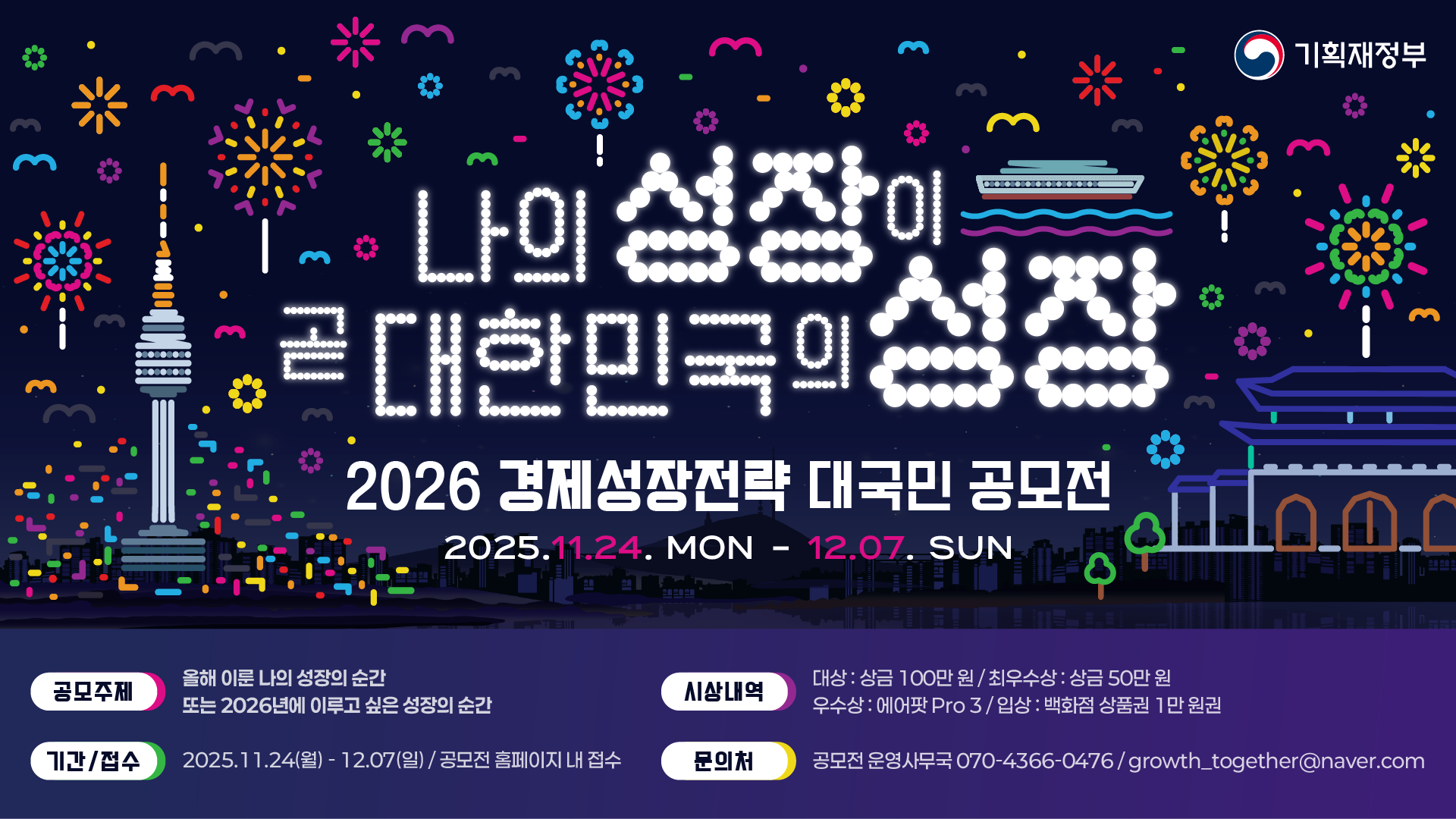 ์ฌํด ๋น์ ์ด ํด๋ธ '์ฑ์ฅ', ๋ํ๋ฏผ๊ตญ์ด ๊ณต์ ์ธ์ ํด์ค์ ๐ฐ๐ท jks ๋ด๋์ปค, '์ฑ์ฅ'์ด๋ผ๊ณ ํ๋ฉด ๋ญ๋ถํฐ ๋ ์ค๋ฅด๋์? ํฐ ์ฑ๊ณผ, ํ๋ คํ ๋ฌด๋, ํน๋ณํ ๊ธฐํ ๊ฐ์ ๊ฑธ ๋จผ์ ๋ ์ฌ๋ฆฌ๊ธฐ ์ฌ์ด๋ฐ์. ํ์ง๋ง ์ฌ์ค ์ฐ๋ฆฌ์ ์ฑ์ฅ์ ํจ์ฌ ๋ ๊ฐ๊น์ด ๊ณณ์ ์จ์ด ์์ด์. ์ฒ์ ๋ฌ๋ฆฌ๊ธฐ๋ฅผ ์์ํ ๋ ์ ๊ธฐ๋ก, ๋๋ ค์ ์ง๋ง ๊ฒฐ๊ตญ ํด๋ธ ์์ ๋์ , ๋๊ตฐ๊ฐ๋ฅผ ๋๊ธฐ ์ํด ์ ํํ ๋ฐ๋ปํ ์๋น์ฒ๋ผ์ ๐ฑ. ์ด๋ ๊ฒ ์์ธ ๊ฐ์ธ์ ์ฑ์ฅ์ ๊ฒฐ๊ตญ ๊ตญ๊ฐ ๋ฐ์ ๊ณผ ๊ตญ๋ฏผ ํ๋ณต์ผ๋ก ์ด์ด์ง๊ณ , ๊ทธ ์ํ์ ๋ง๋๋ ๊ฒ์ด ๋ฐ๋ก ์ ๋ถ์ '2026 ๊ฒฝ์ ์ฑ์ฅ์ ๋ต'์ธ๋ฐ์. ๊ทธ๋์ ๊ธฐํ์ฌ์ ๋ถ๊ฐ ๋ด๋์ปค์๊ฒ ๋ฌผ์์ด์. "์ฌ๋ฌ๋ถ์ด ์ด๋ฃฌ ์ฑ์ฅ์ ์๊ฐ์ ์ธ์ ์ธ๊ฐ์?" ์ง๊ธ, ๊ทธ ์๊ฐ์ ๋ณด์ฌ์ฃผ๊ธฐ๋ง ํ๋ฉด ๋ผ์. 12์ 7์ผ๊น์ง ์งํ๋๋ '2026 ๊ฒฝ์ ์ฑ์ฅ์ ๋ต ๋๊ตญ๋ฏผ ๊ณต๋ชจ์ '์์๋ ๋ ๊ฐ์ง ์ค ํ๋๋ฅผ ํํด ์ฐธ์ฌํ ์ ์์ด์. - ์ฌํด ์ด๋ฃฌ ์ฑ์ฅ์ ์๊ฐ์ ๋ด์ ์ค์ ์ด๋ฏธ์ง·์์